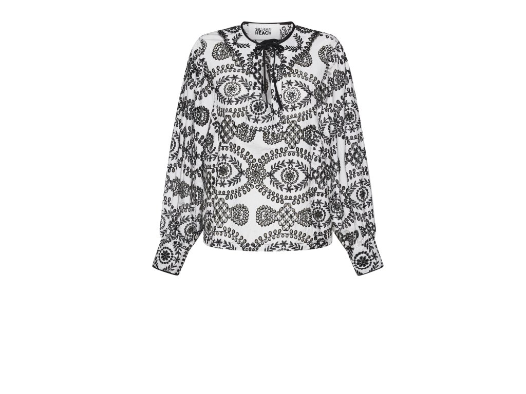 Sofistikovaná halenka s vizuálně výrazným ornamentálním motivem, který vyjadřuje bohatou a osobitou eleganci. Rafinovaný design je doplněn pečlivými detaily, které definují luxusní kousek. Je to model určený pro moderní šatník, který klade důraz na stylistické vyjádření a estetickou propracovanost.