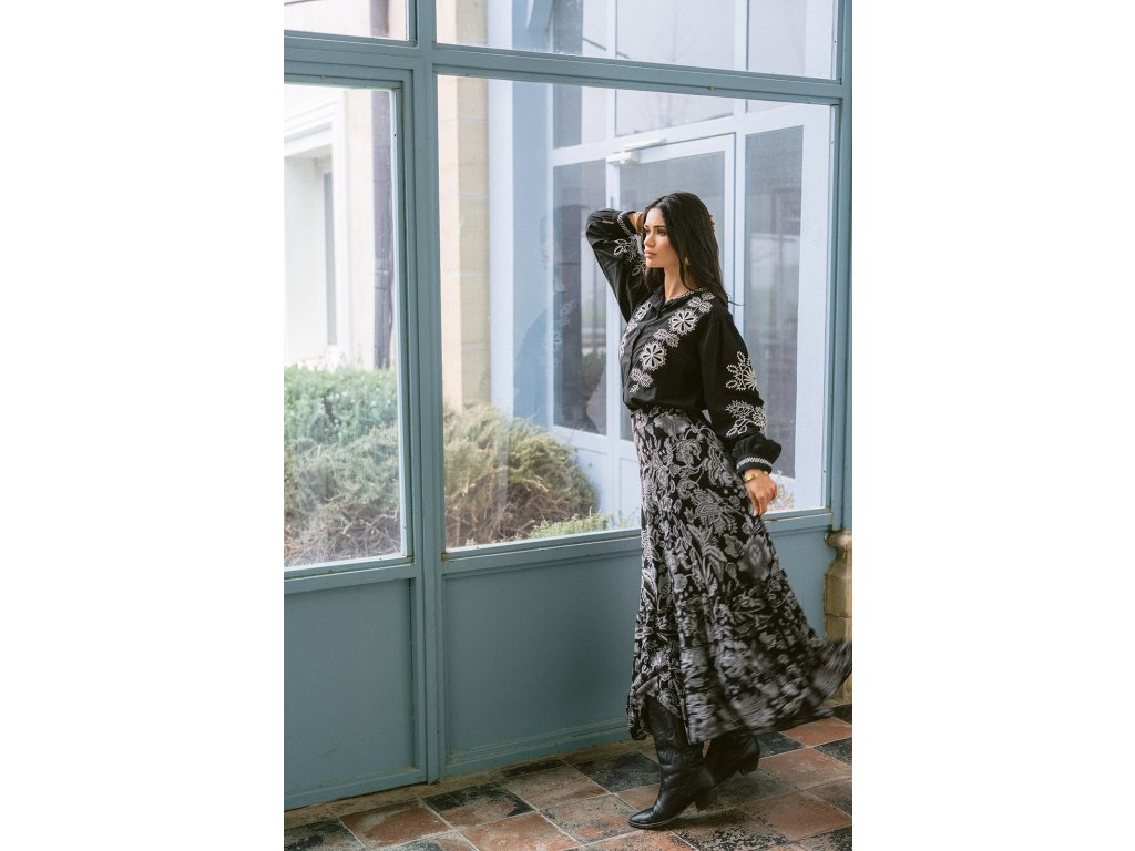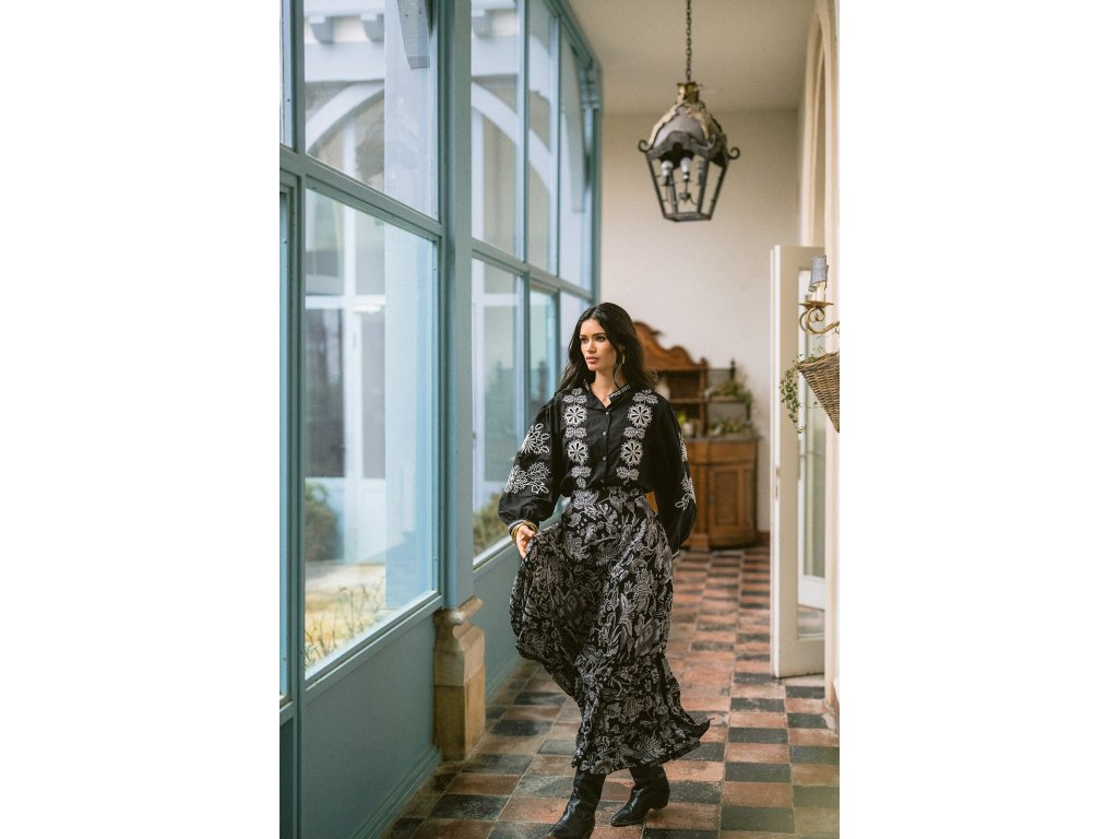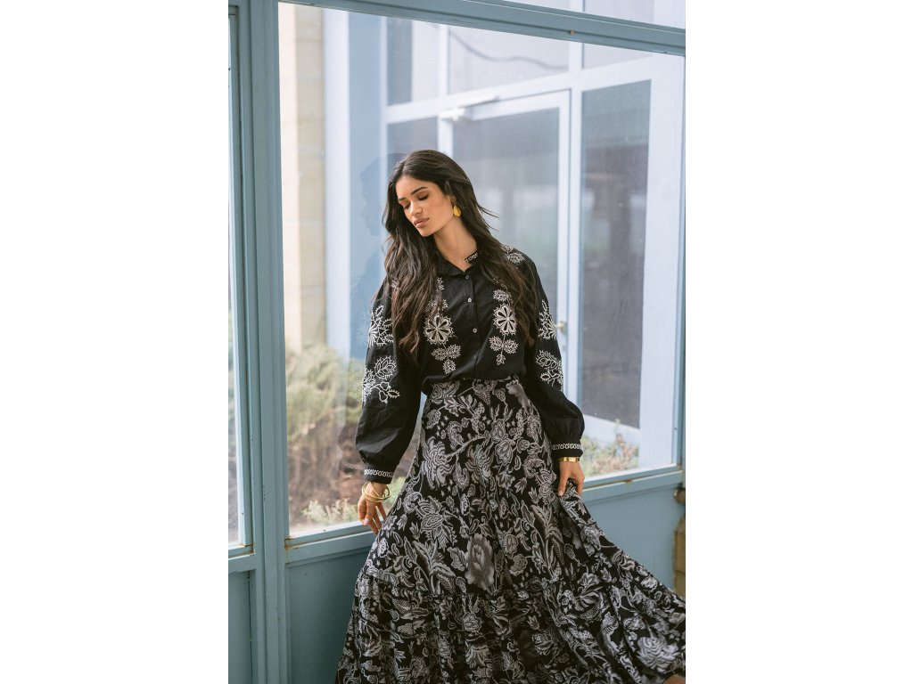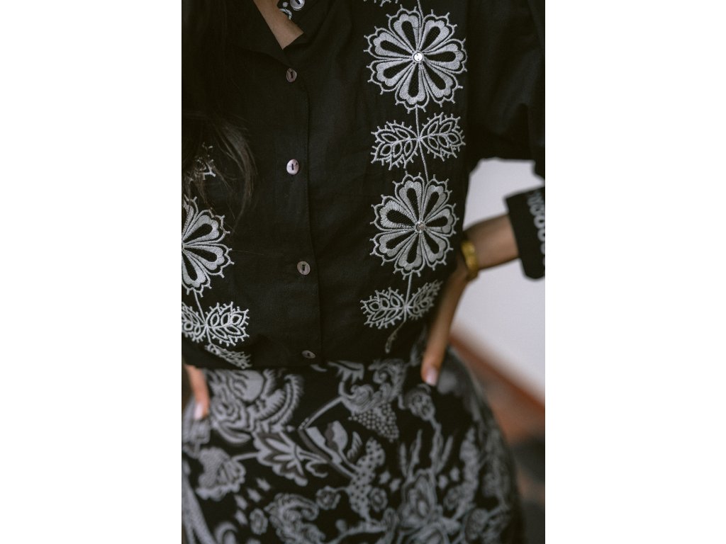 Dámská halenka španělské značky Piti Cuiti s vyšívaným květovaným vzorem. Košile má zapínání na knoflíky, je vyrobena ze 100% bavlny. Detaily v podobě vyšívaných lemů na rukávech i na límci.