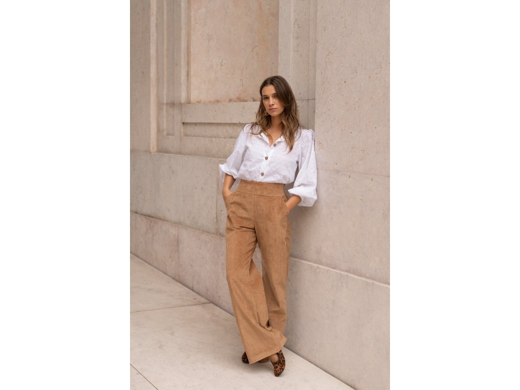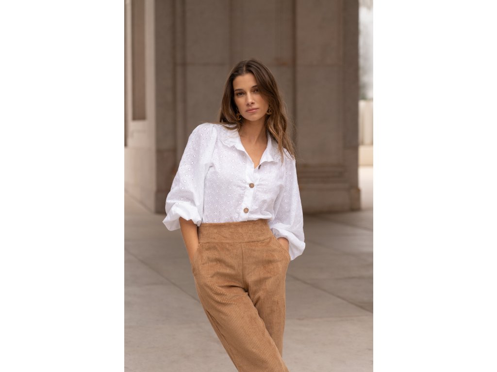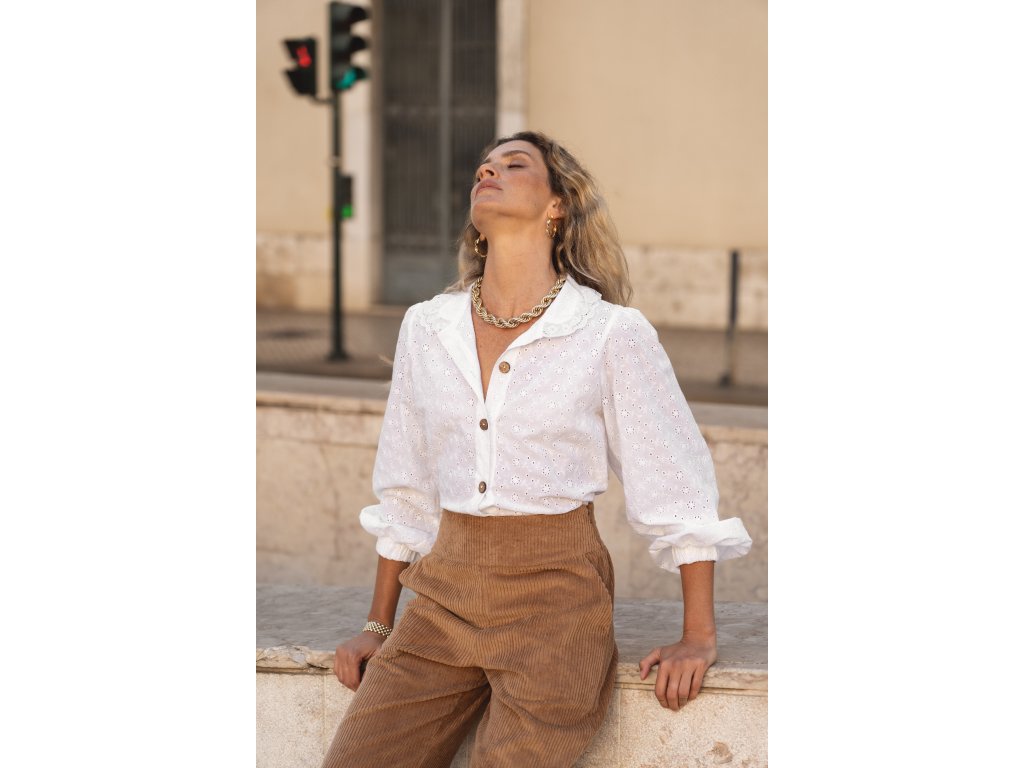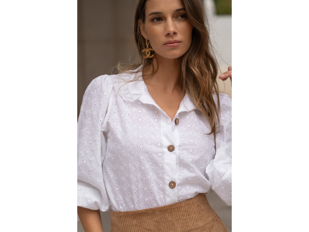 Dámská blůzka portugalské značky Sole s tříčtvrtečným rukávem s madeirovou výšivkou. Halenka má jednořadé knoflíkové zapínání a mírně volánkovitý rukáv. Působí velice žensky a elegantně, perfektně padne ke kalhotům i pouzdrovým sukním.