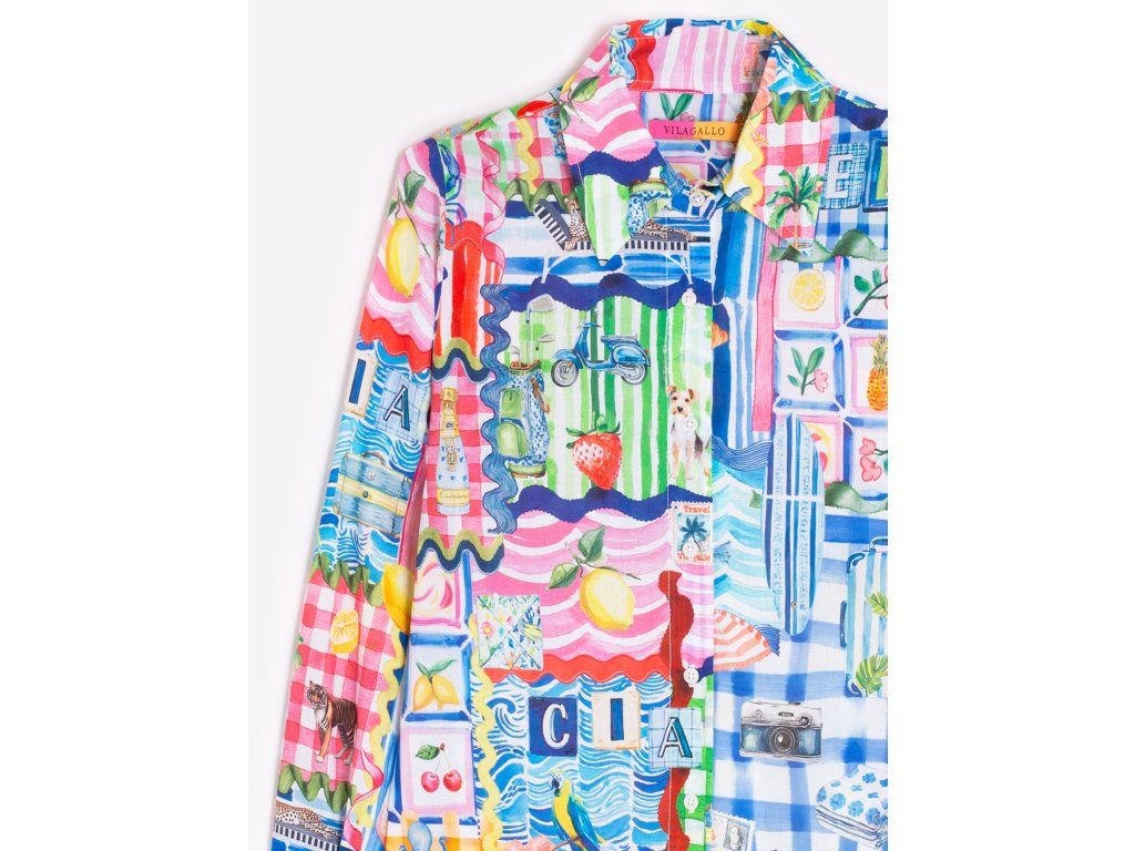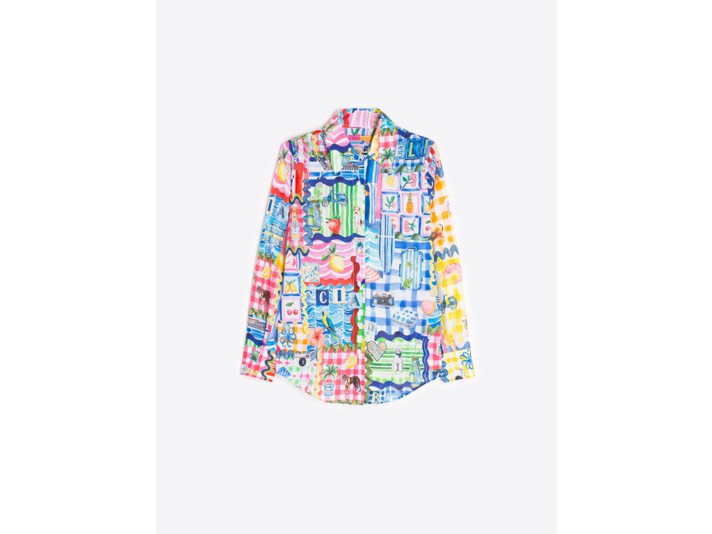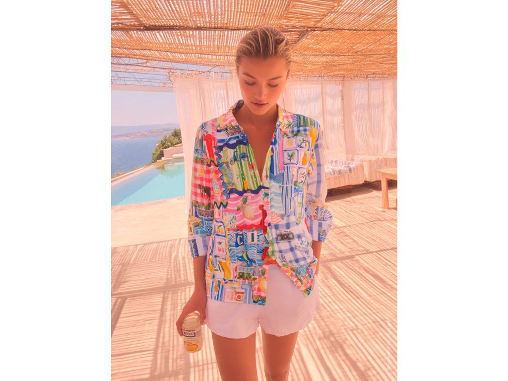 Košile s capri potiskem a letními motivy. Košilový límec, zapínání na knoflíky, dlouhé rukávy na knoflíky a zaoblený lem.