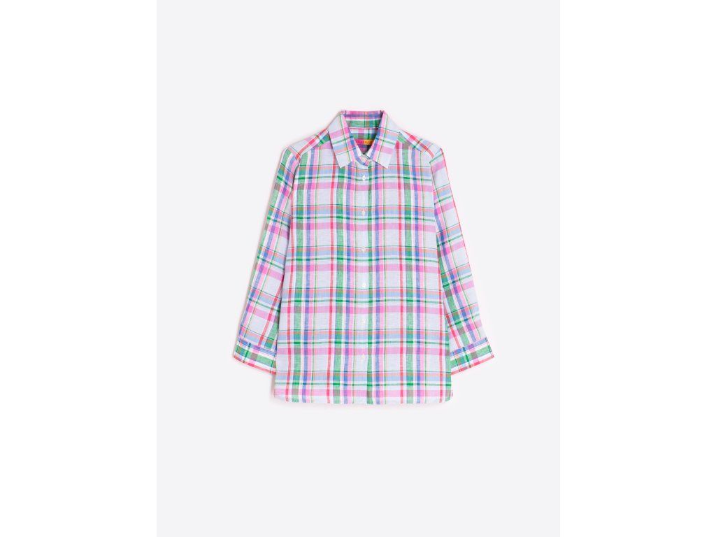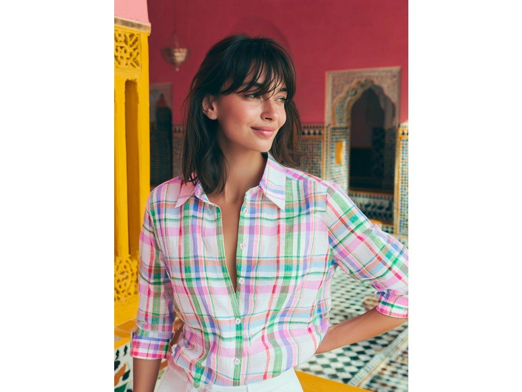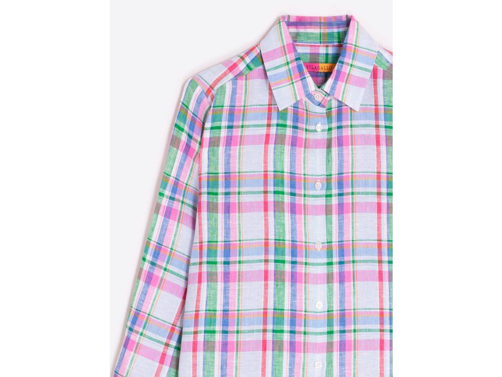 Vícebarevná kostkovaná košile v odstínech růžové, zelené, modré a bílé. Rovný střih s klasickým košilovým límečkem, tříčtvrtečními rukávy a rovným lemem.