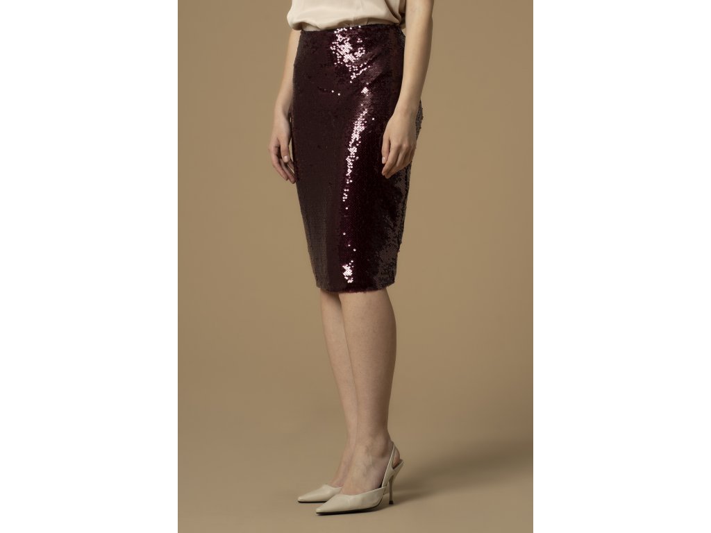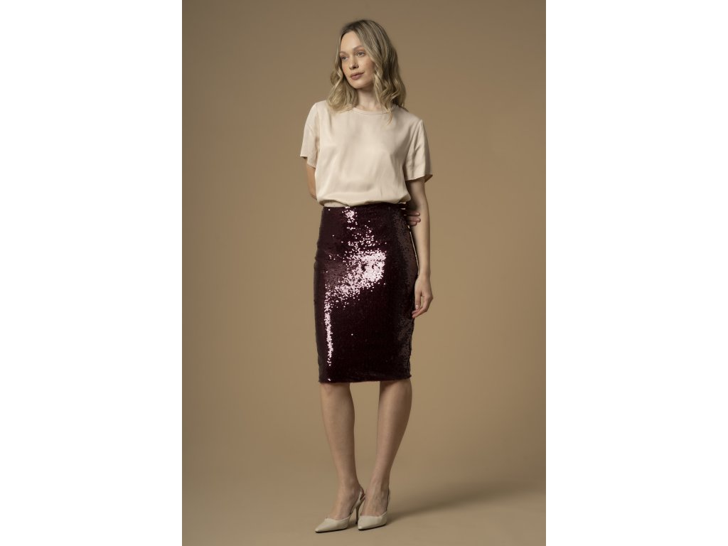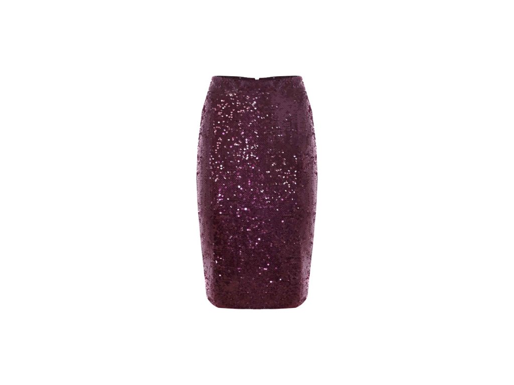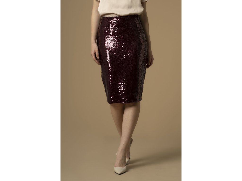 Klasický střih této pouzdrové sukně je zdoben flitrovanou látkou, která dodává sukni styl a odvážnost. Tento model se vyznačuje běžným střihem a přiléhavou siluetou.