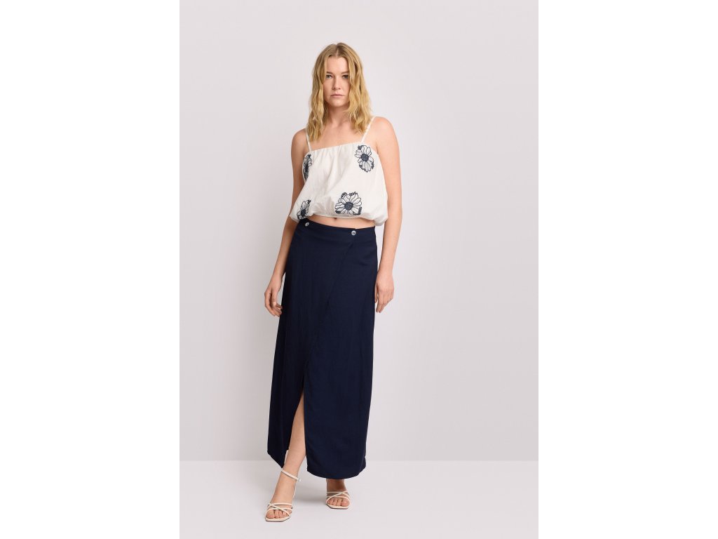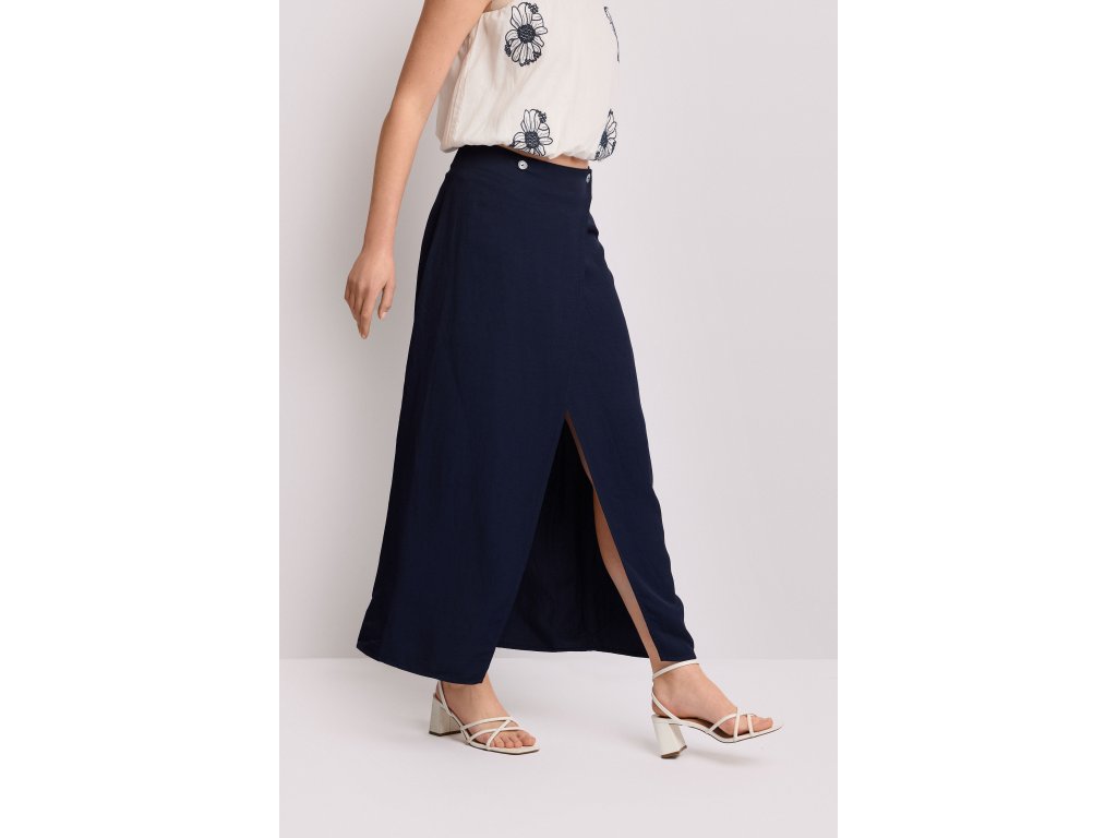 Dlouhá sukně Kocca z kolekce Pure Verve. Sukni zdobí zavinovací střih s centrálním rozparkem, který zdůrazňuje vertikální tvar oděvu. Strukturovaný vysoký pas s poutky na opasek a kapsami. Ideální pro sofistikované a praktické městské outfity.