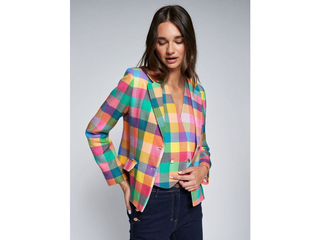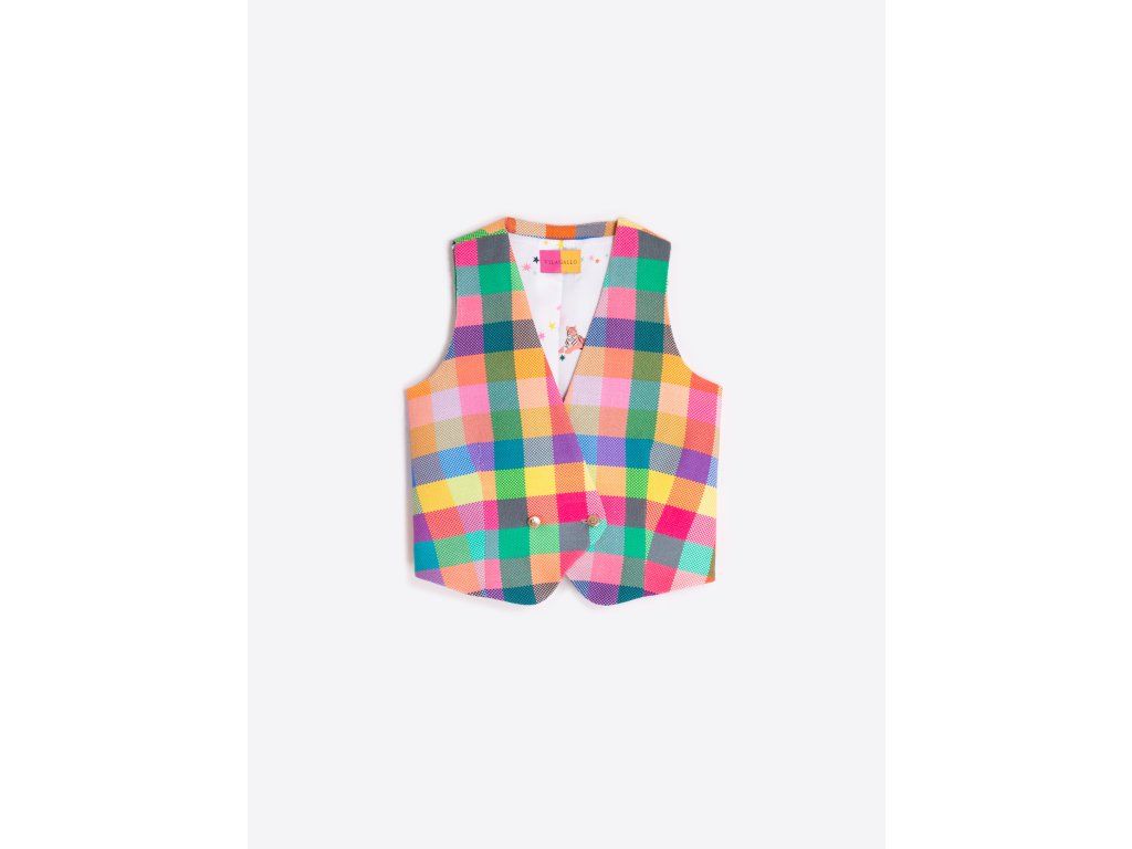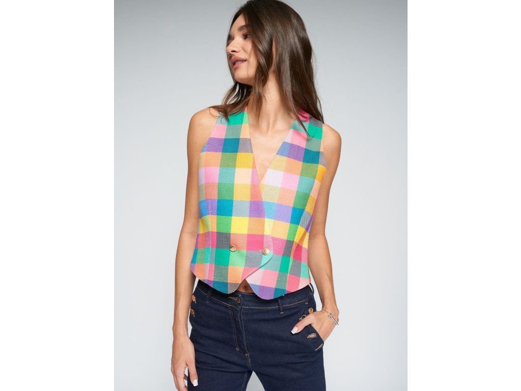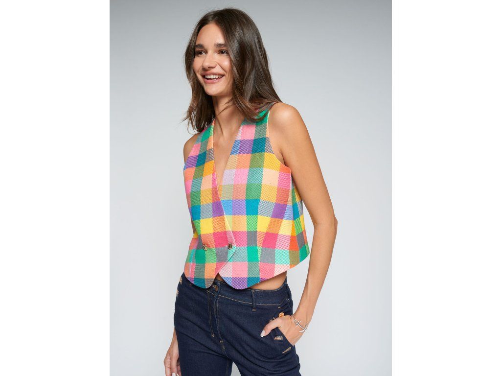 Vícebarevná kostkovaná vesta s výstřihem do V a dvouřadým zapínáním na dva kovové knoflíky. Špičatý lem. Podšívka s potiskem. Přiléhavá silueta a strukturovaná tkanina.