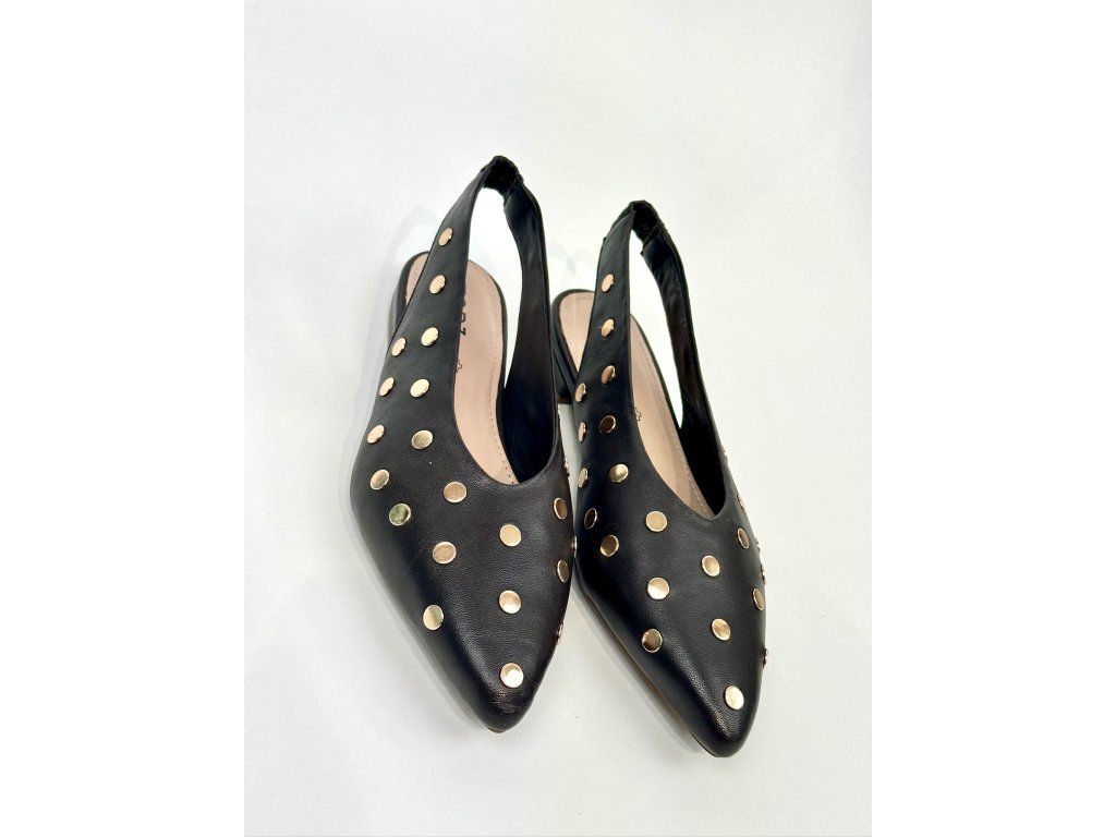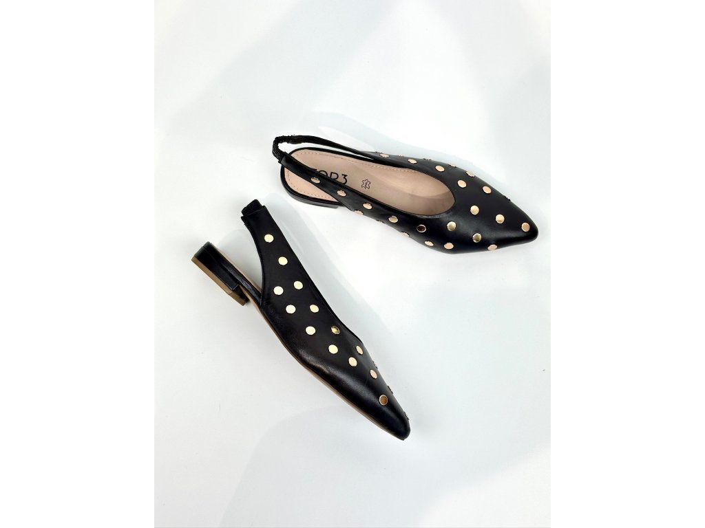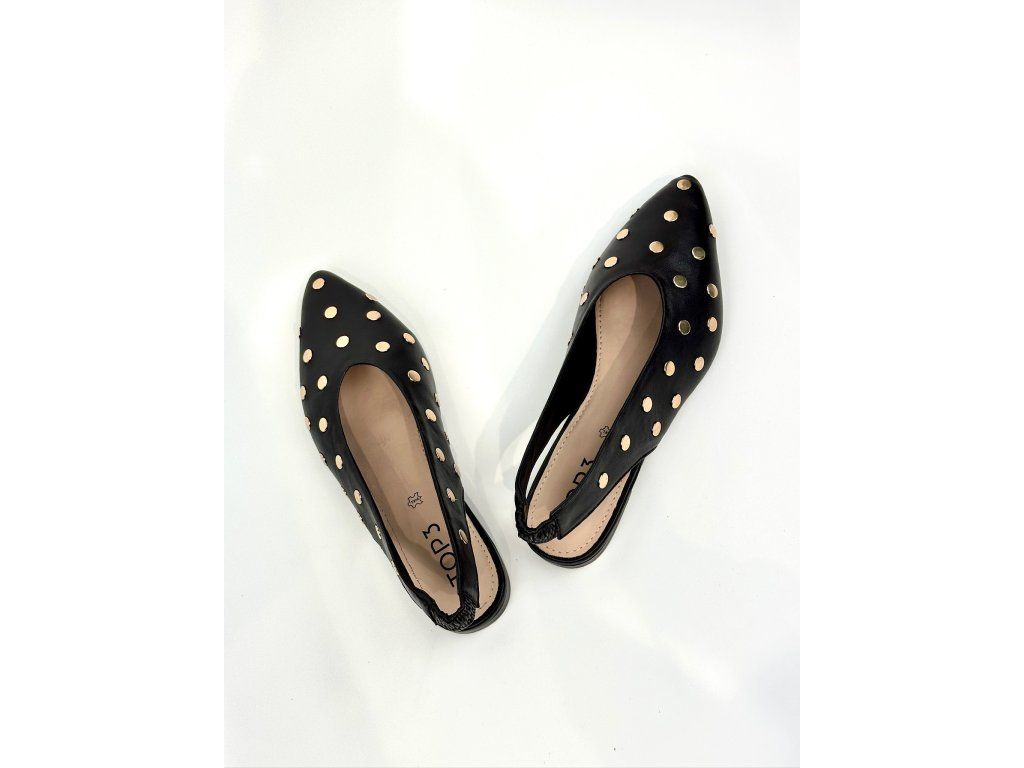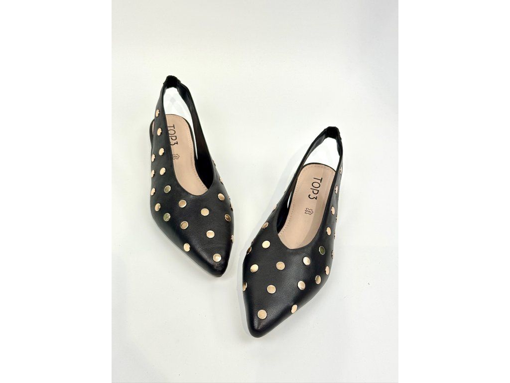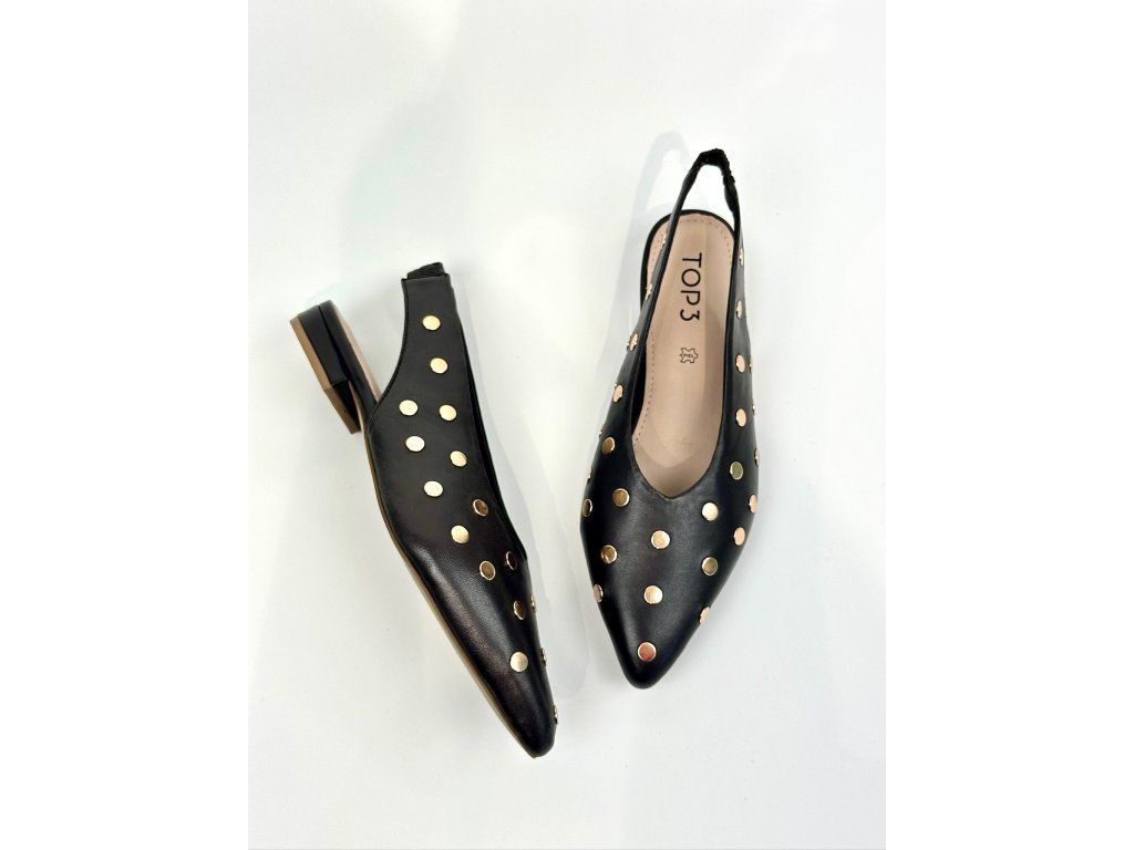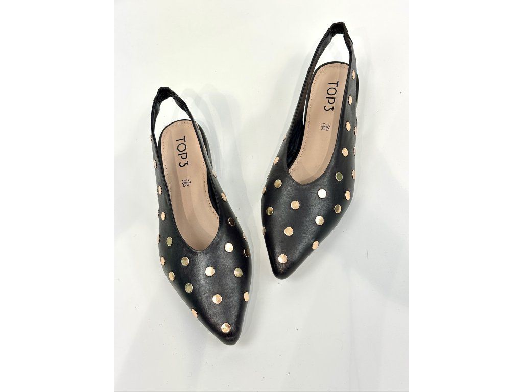 Dámské balerínky španělské značky Top3 s otevřenou patou. Balerínky mají zlaté vybíjení po celém svršku. Řemínek na patě má elastickou gumičku, takže se krásně přizpůsobí Vaší noze. Vykrojení do špičky v kombinaci s nízkým blokovým podpatkem je velmi elegantní a nadčasové.
