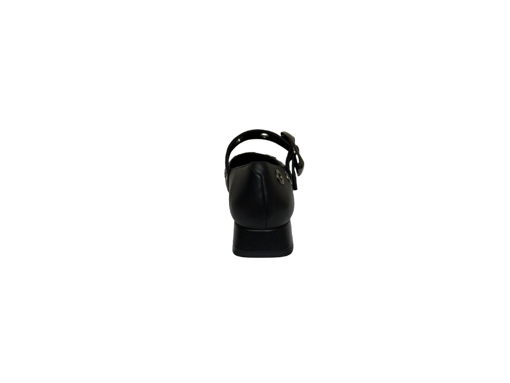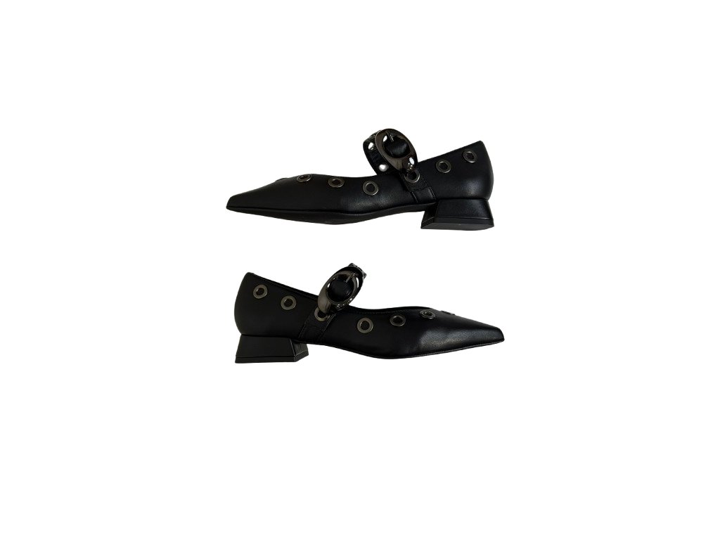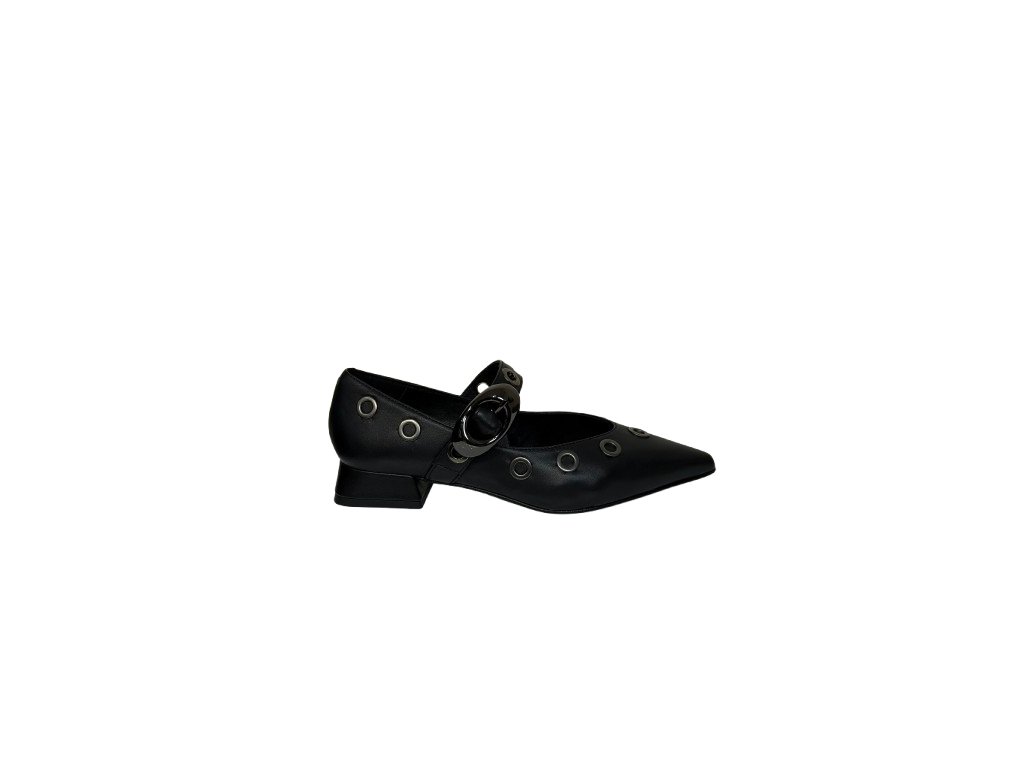 Obuv je vyrobena z jemné hadké kůže, v přední části a po obvodu lemů jí zdobí vybíjené kroužky z černého kovu. Pásek přes nárt má nastavitelnou délku. Balerínky mají nízký blokový podpatek o výšce 25 mm, což je v kombinaci s hladkou kůží ideální variatnou pro to nejpohodlnější a nejelegantnější denní nošení.