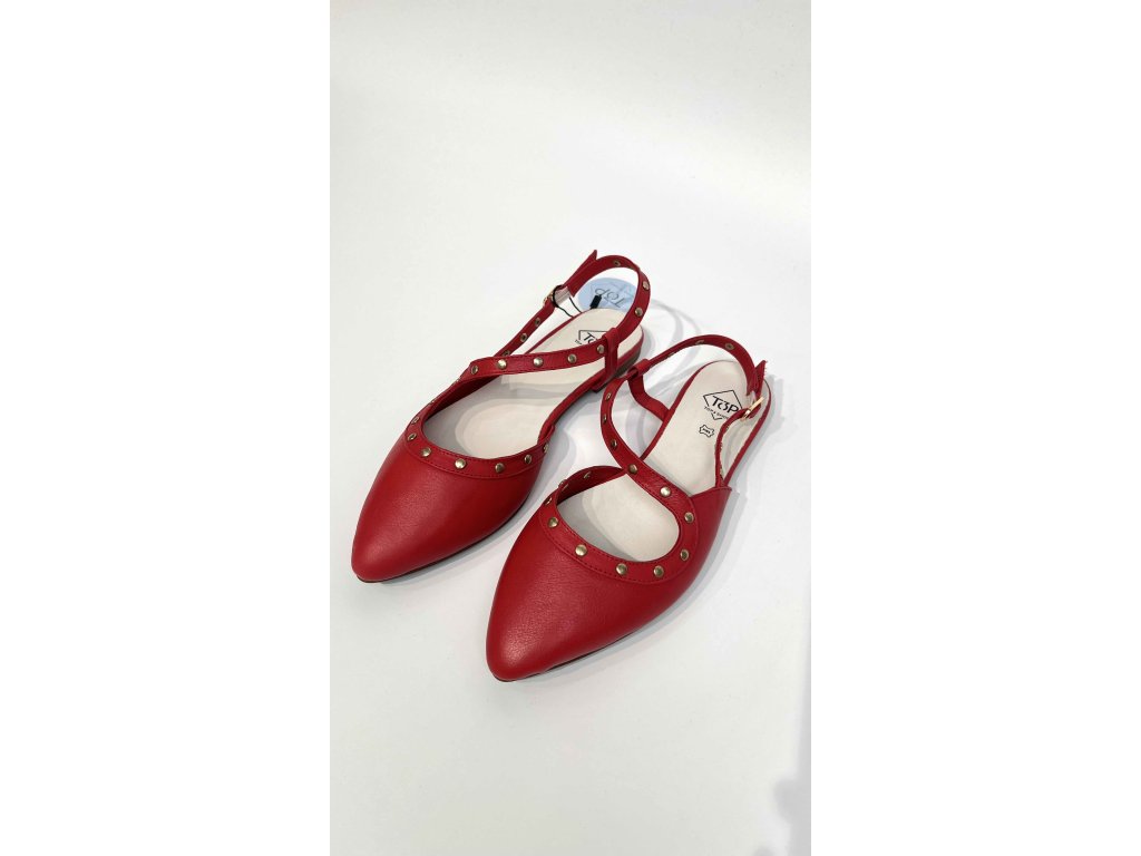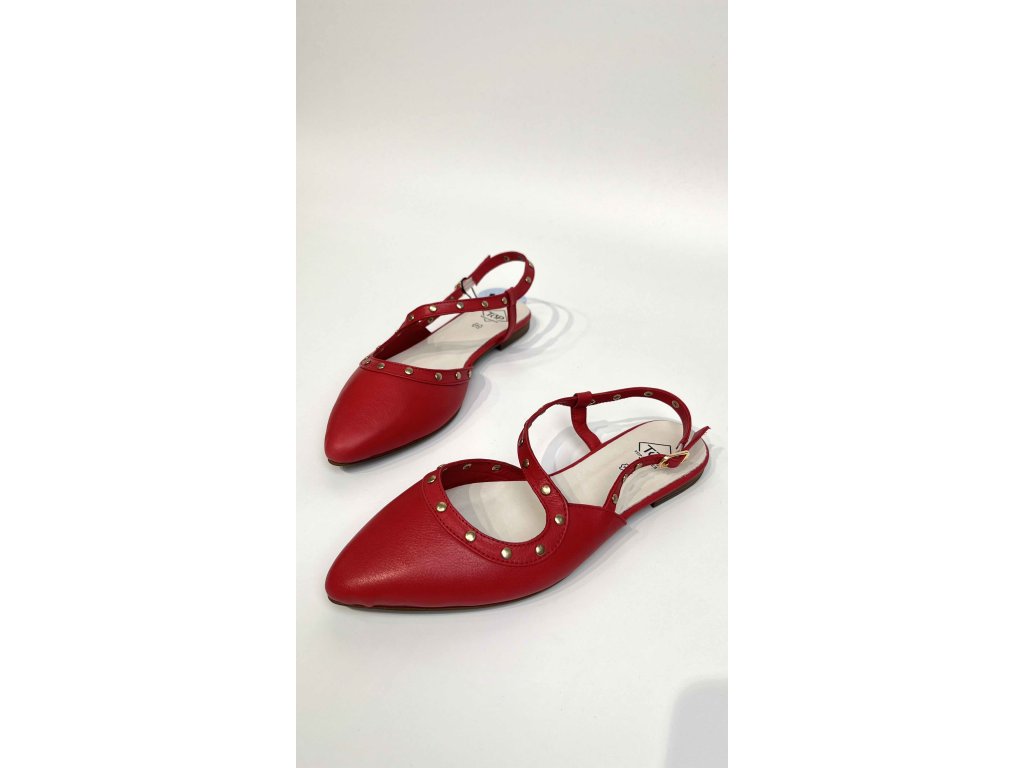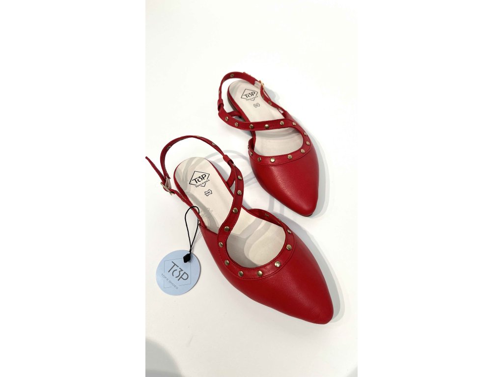 Dámské baleríny Top3 v červené barvě se cvoky. Balerínky jsou vyrobeny z jemné hladké strukturované kůže. Mají špičatý tvar a polootevřený střih s jemným vybíjeným řemínkem, jehož délku si můžete libovolně upravovat. Tyto balerínky jsou perfektní volbou na léto, různé letní akce pod širým nebem nebo i na večerní procházky po promenádě.