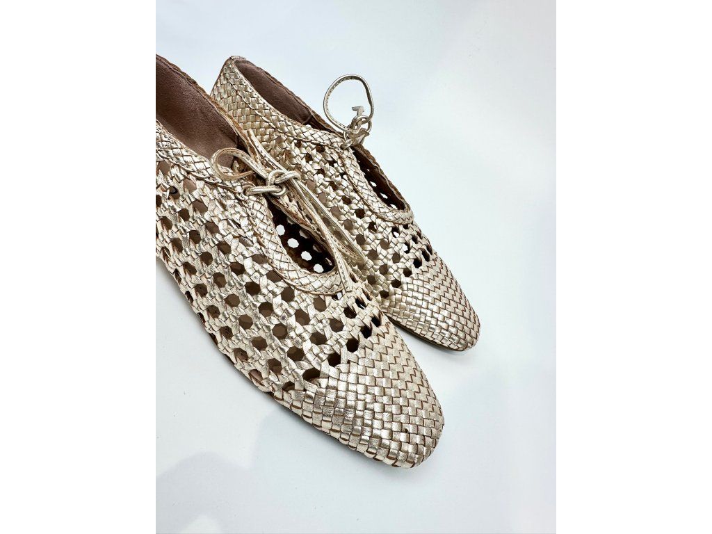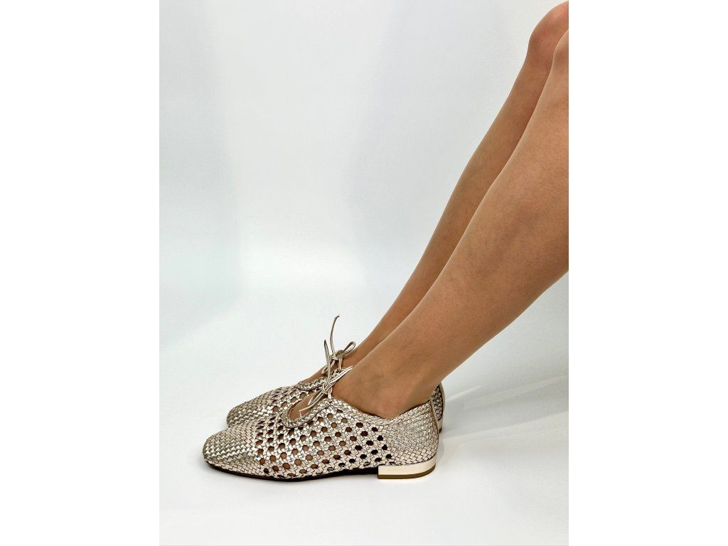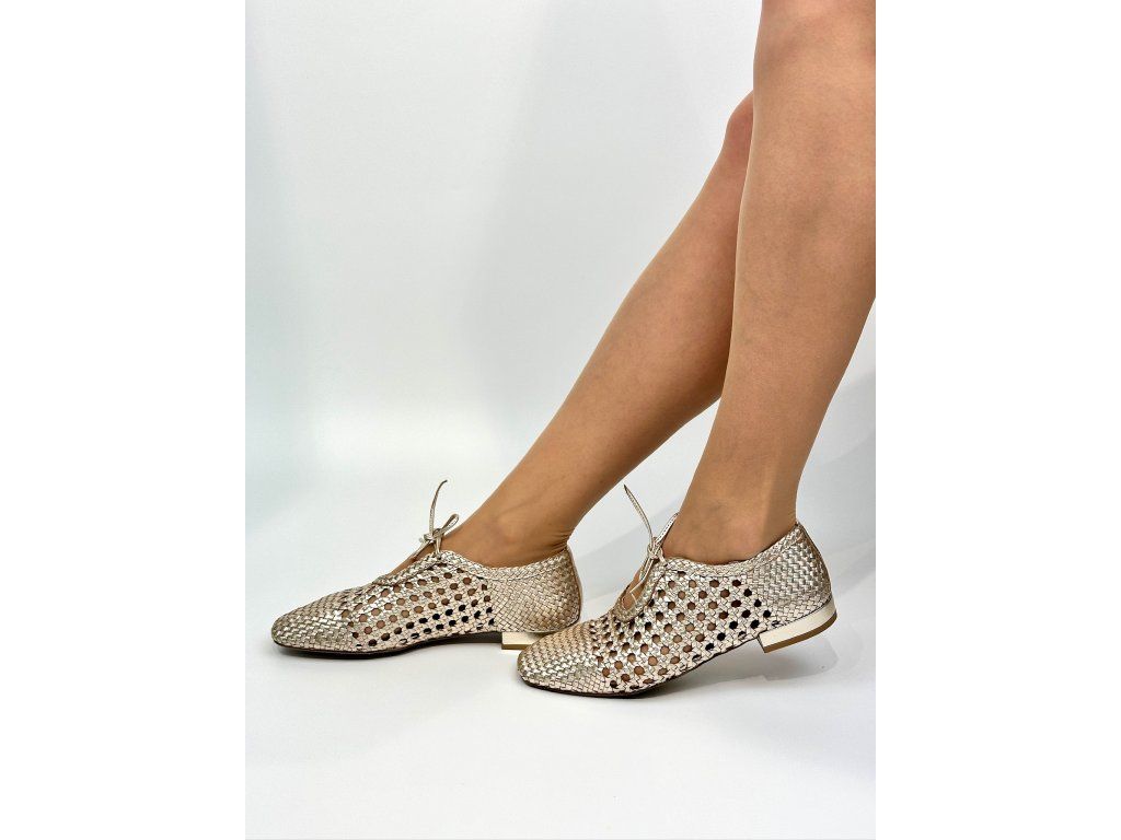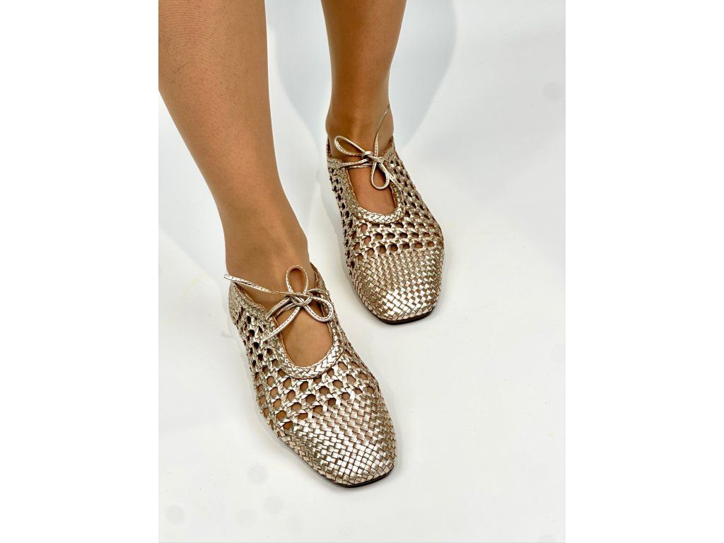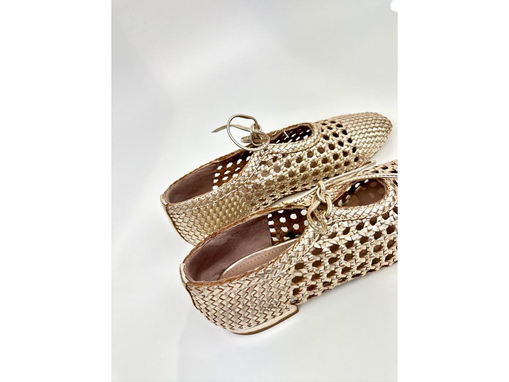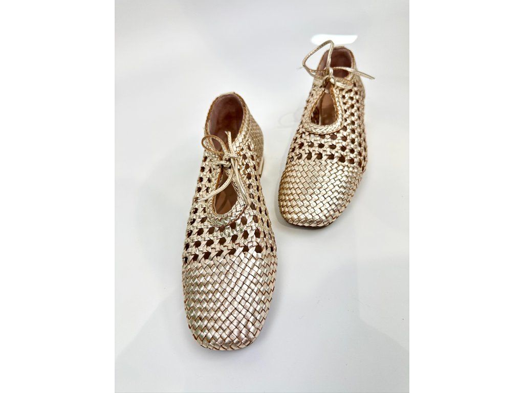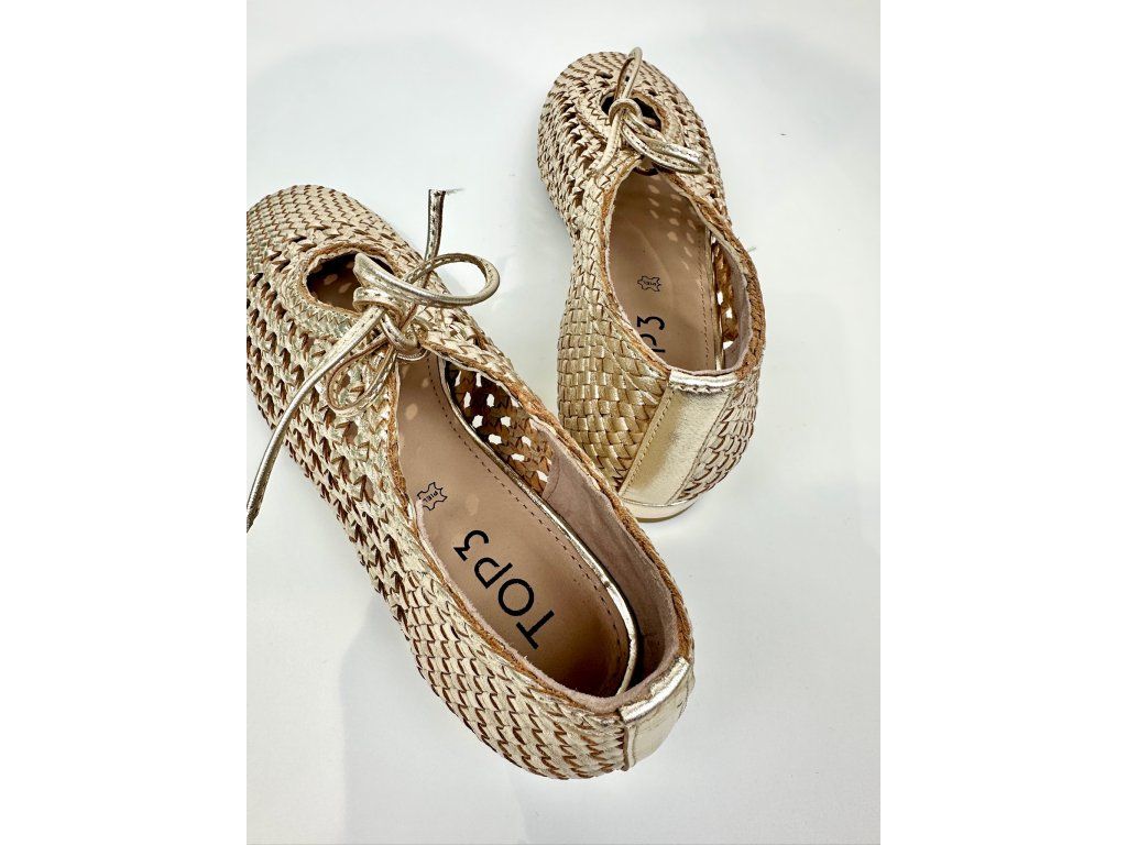 Dámské baleríny španělské značky Top3 v jedinečném provedení se čtvercovou špičkou a šněrováním. Obuv má zajímavý proplétaný design v metalické zlaté barvě. Je vyrobena z jemné hladké kůže s metalickým povrchem. Díky svému designu a použitým materiálům je obuv velice komfortní a ideální na každodenní nošení, ale vhodná je i na slavnostnější příležitosti.