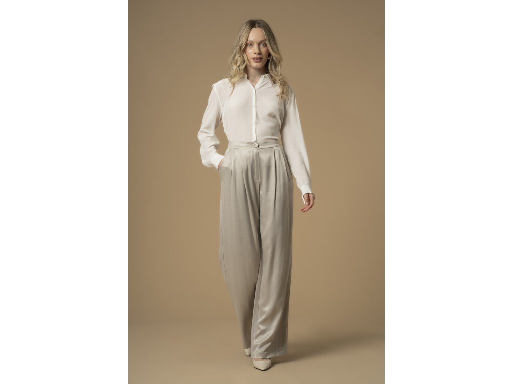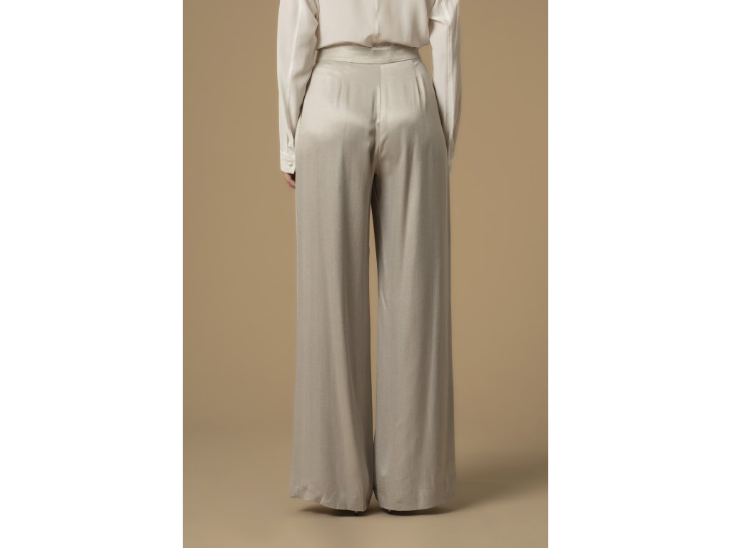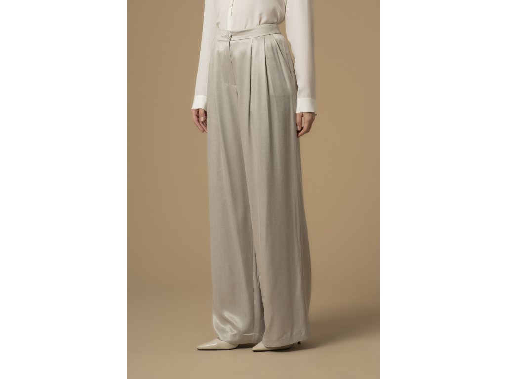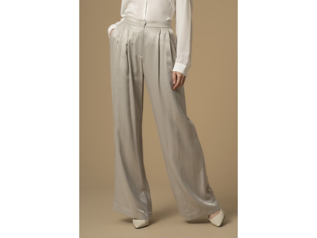 Tyto kalhoty z kolekce Pure Verve vyzařují sofistikovaný styl a mají volný, lehce palazzo střih, ideální pro každodenní nošení. Jsou vyrobeny z lesklé látky, mají v pase záševky a zapínání na zip a knoflík.