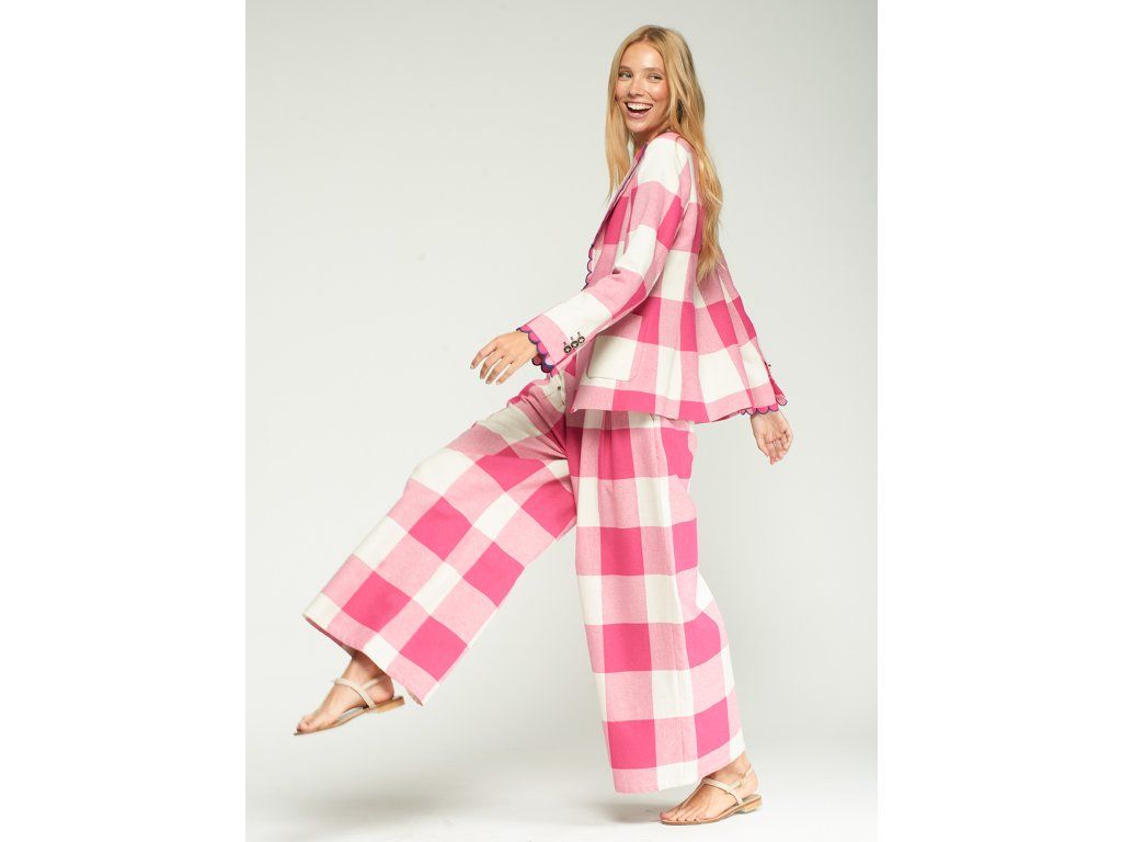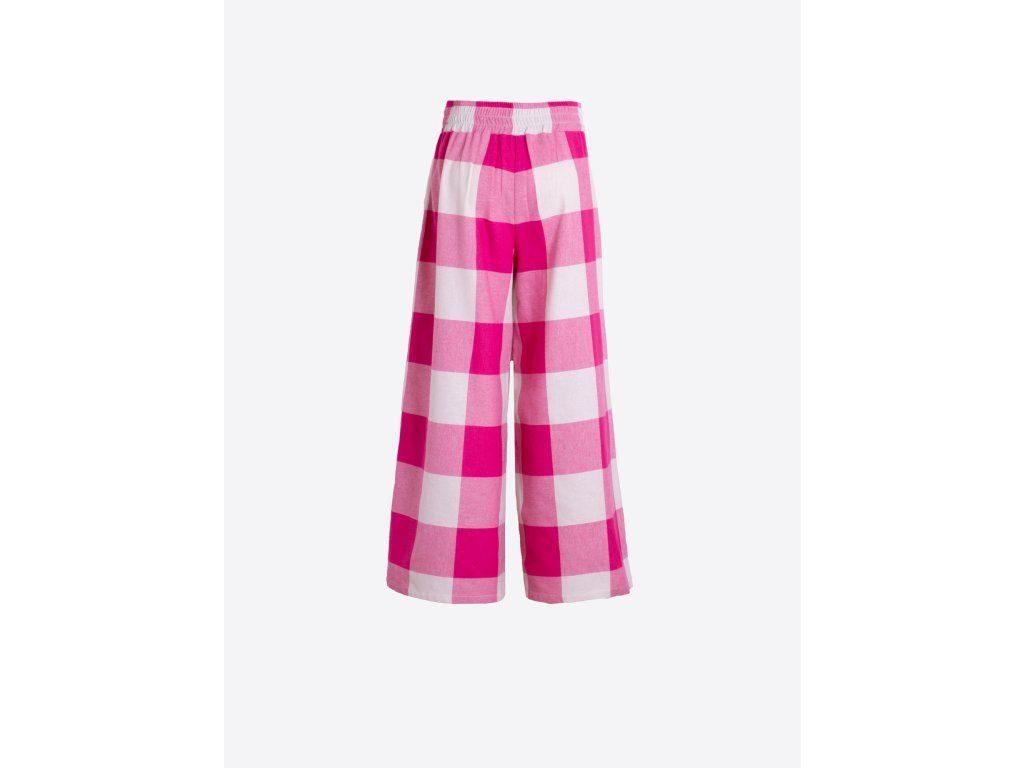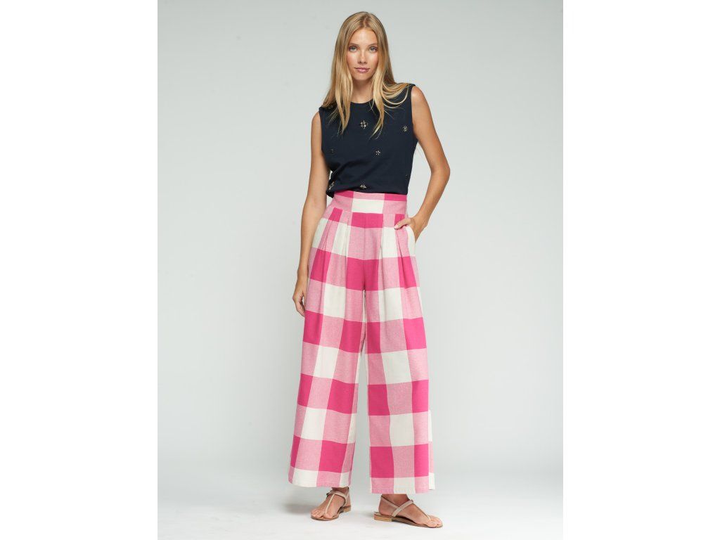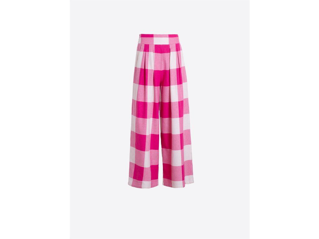 Široké kalhoty se sklady ve vrchní části v růžovo-bílém kostkovaném vzoru. Vysoký pas s širokým lemem a širokými nohavicemi. Boční kapsy pro pohodlnost a praktičnost při nošení.