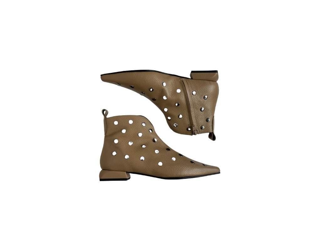 Dámské kotníčkové boty španělské značky Dibia. Obuv je vyrobena z jemné hladké kůže, má vybíjené detaily po celém povrchu. Kotníčkové boty mají špičatý tvar a velmi elegantní nízký blokový podpatek. Díky tomu Vám tato kotníčková obuv nabízí dokonalý komfort při celodenním nošení. Výška podpatku je 35 mm. Obuv má jemné vykrojení na úrovni kotníčků v přední části obuvi a zapínání na zip na vnitřní boční straně.