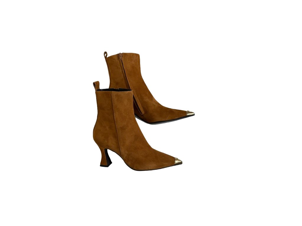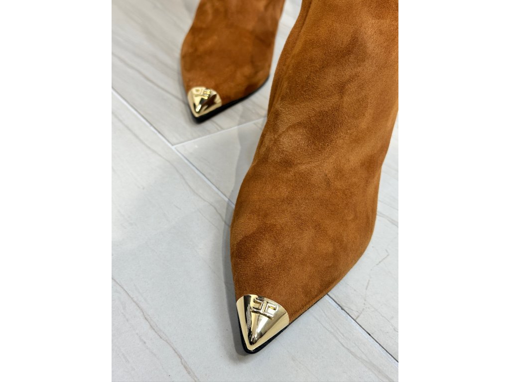Obuv je vyrobena z jemné broušené kůže (semiš), má špičatý tvar a vysoký podsazený podpatek jehlového typu se širší základnou.  Díky tomu Vám tato kotníčková obuv nabízí dokonalý komfort při celodenním nošení. Výška podpatku je 80 mm.