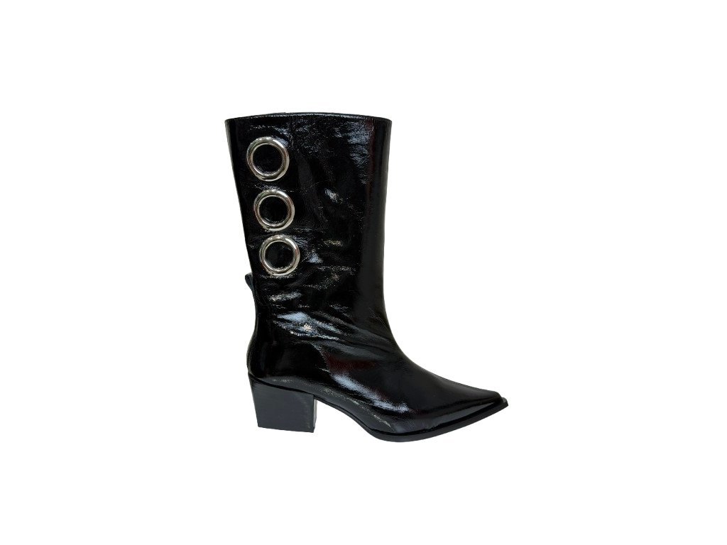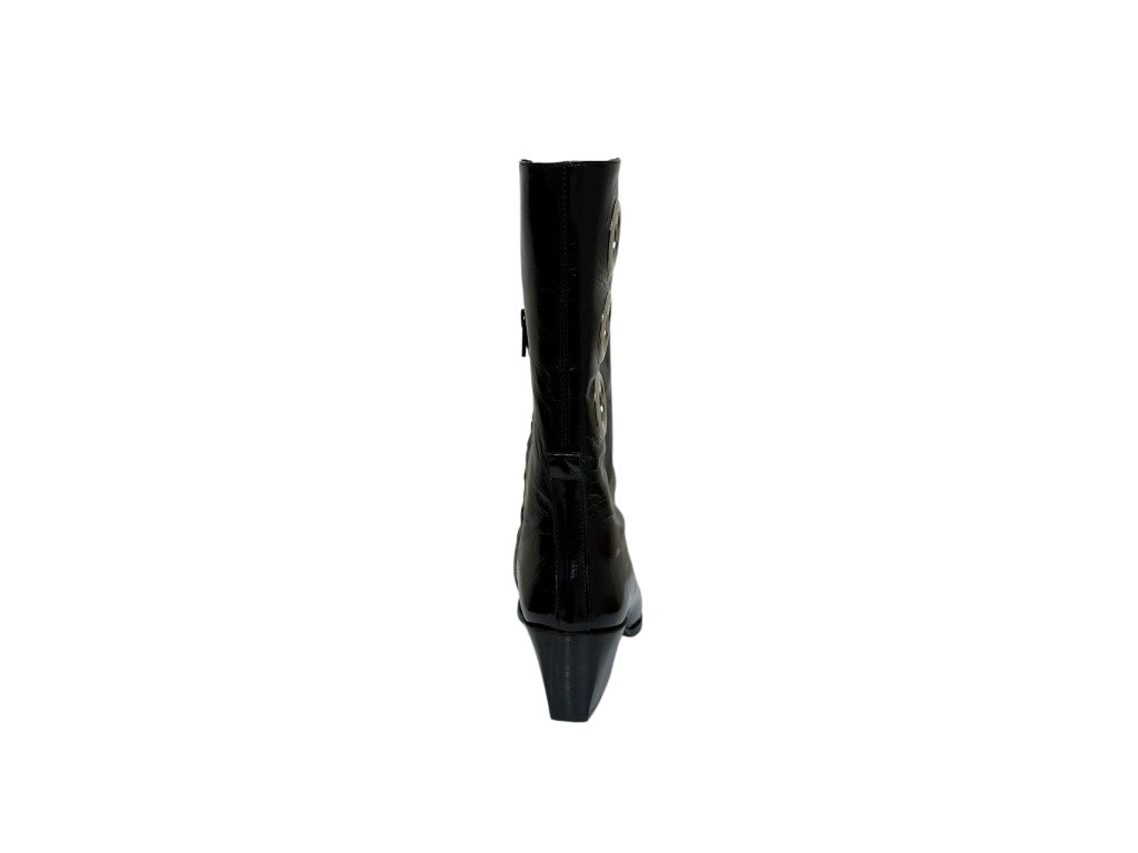 Dámské poloholeňové boty španělské značky Ezzio kovbojského střihu v lakovaném provedení. Precizní, ruční a originální zpracování těch nejjemnějších kůží spojené s nápaditým designem vytváří jedinečné kousky, které nikde jinde nenajdete.