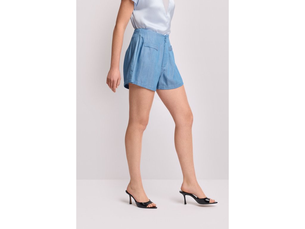 - Vysoký pas s dvojitým předním zapínáním na knoflíky a rafinovanými záševky, které krásně definují siluetu