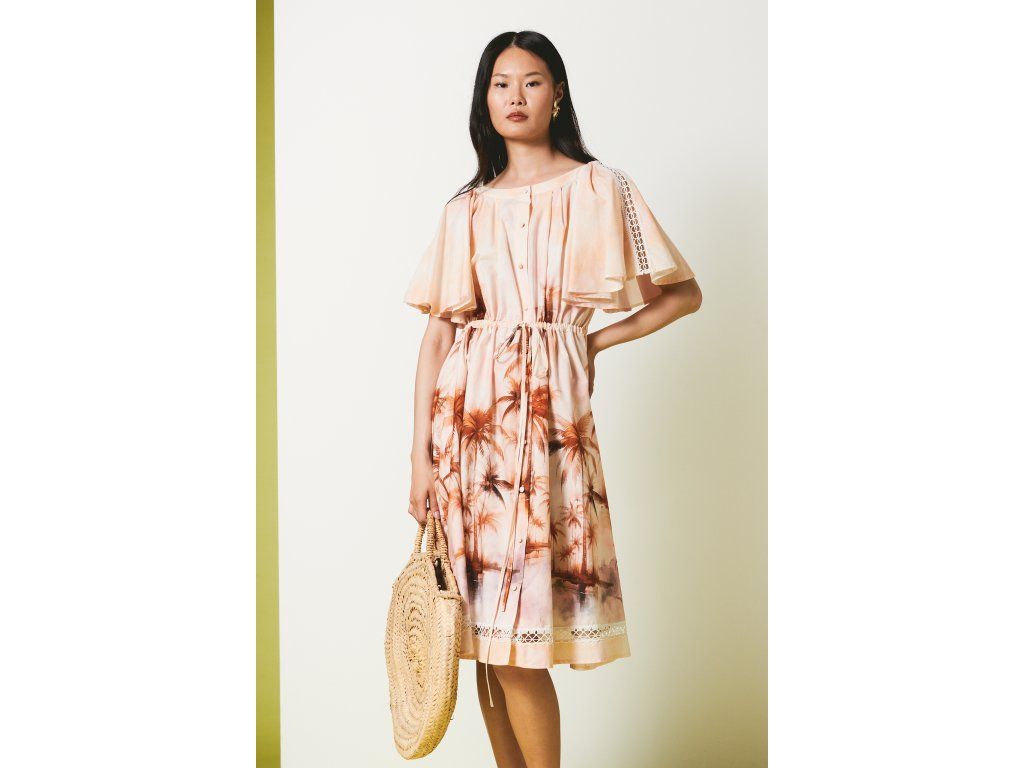 Dámské šaty italské značky Milva Mi v midi délce po kolena. Šaty mají motýlkové rukávy, košilový střih s límečkem a zapínáním na knoflíky v přední části. Šaty mají v pase ztahovací gumičku se šňůrkou na utažení a vytvoření hezké siluety v pase. Zároveň opticky předěluje vrchní část a sukni, která je volná, splývavá, s áčkovým střihem a letním exotickým potiskem.