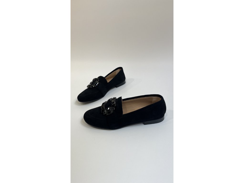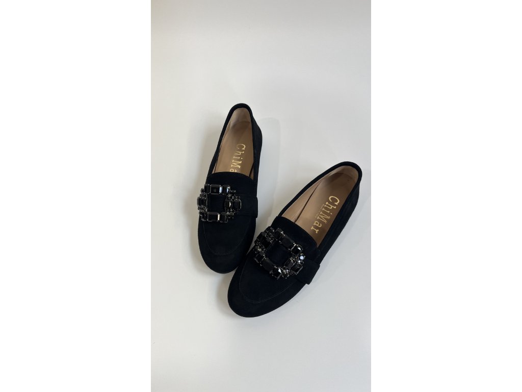 Dámské mokasíny italské značky Chimar. Mokasíny mají klasický tvar s oblou špičkou, nízkým blokovým podpatkem a dekorací v podobě čtvercové spony vykládané kamínky. Obuv je vyrobena z jemné broušené kůže, výška podpatku je 10 mm. Tyto mokasínky budou skvělým doplňkem pro Váš denní outfit do práce nebo na volný čas - kombinace materiálů a tvaru bot Vám zajistí komfort při nošení a stanou se Vaší volbou číslo jedna.