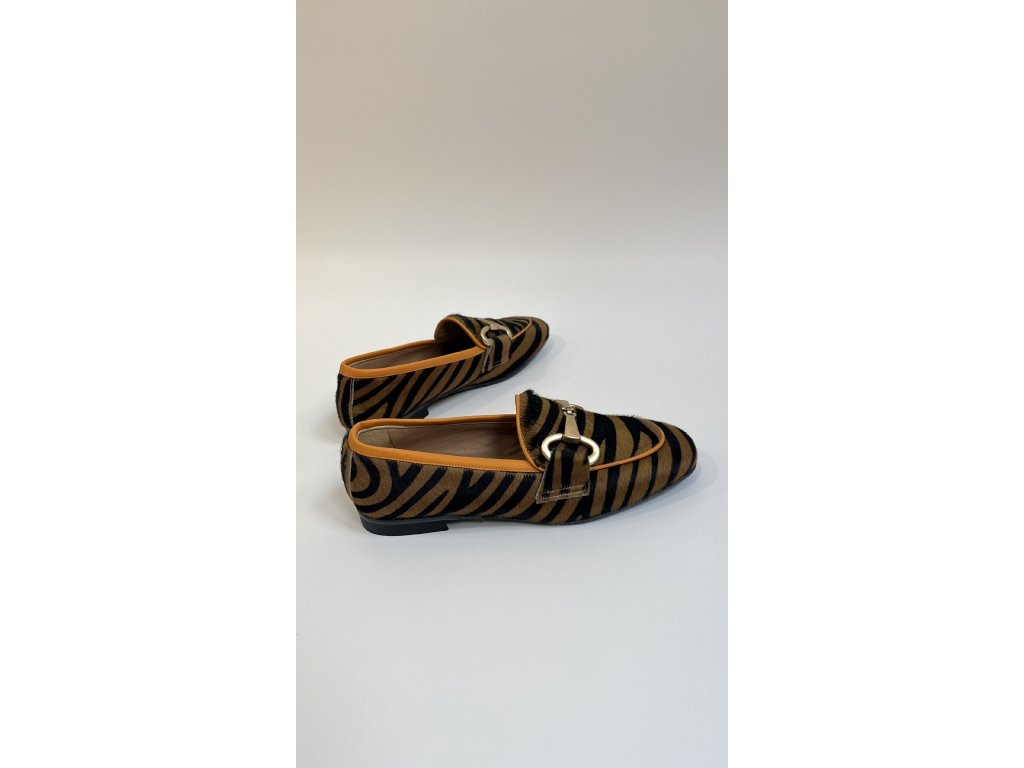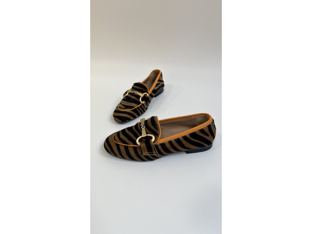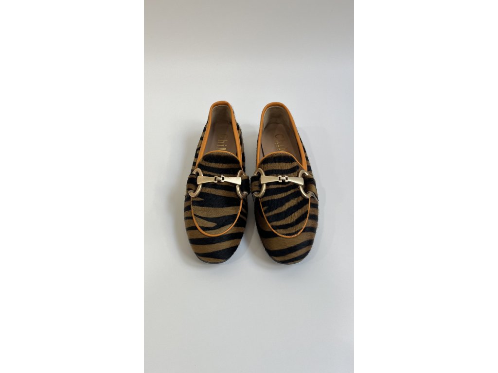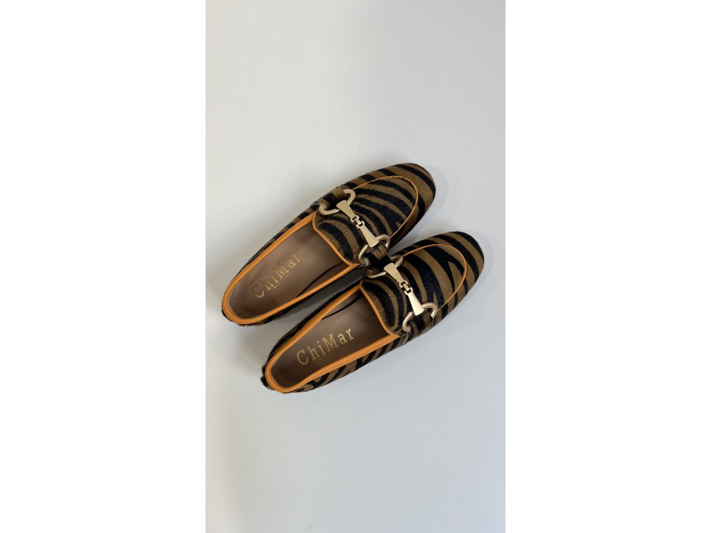 Dámské mokasíny značky Chimar se zvířecím potiskem a srstí. Mokasíny mají klasický tvar s kulatou špičkou, mírný blokový podpatek o výšce 10 mm a zlatou kovovou sponu. Celý svršek obuvi je potažen srstí s tigřím vzorem a zakončen oranžovým lemovaným okrajem.