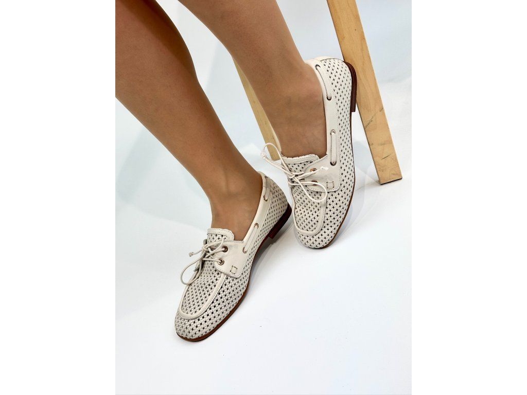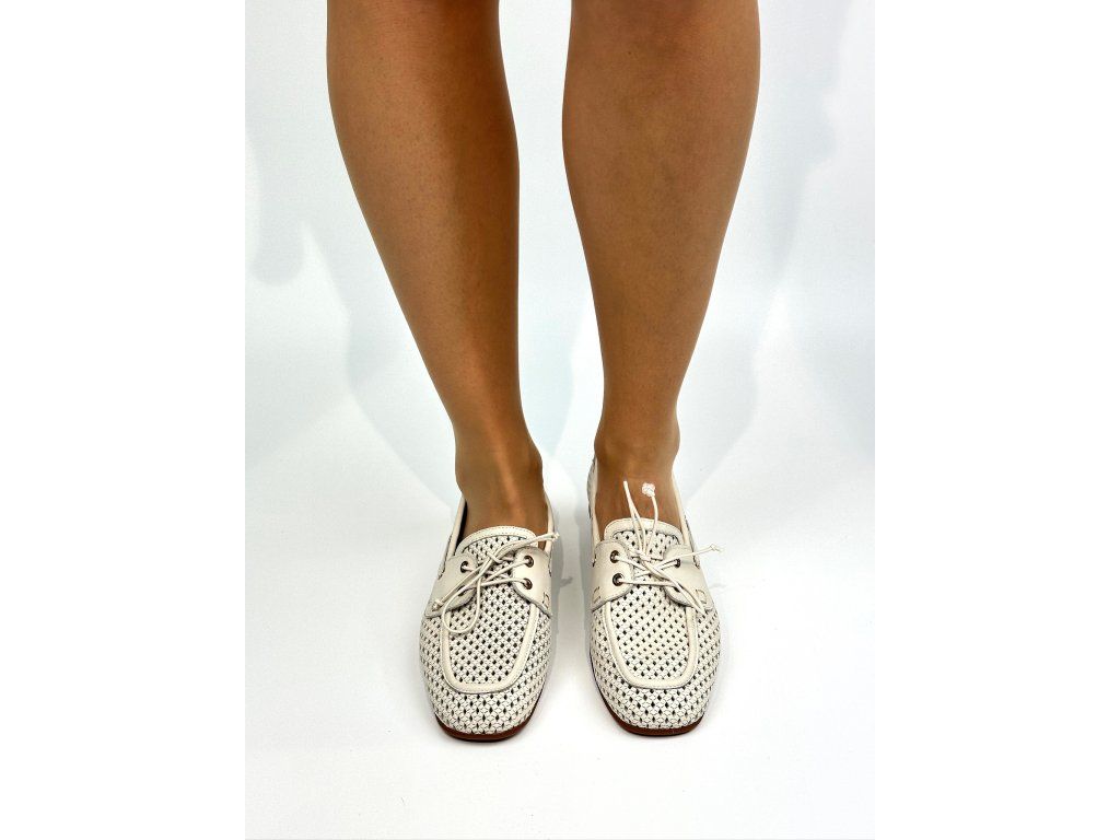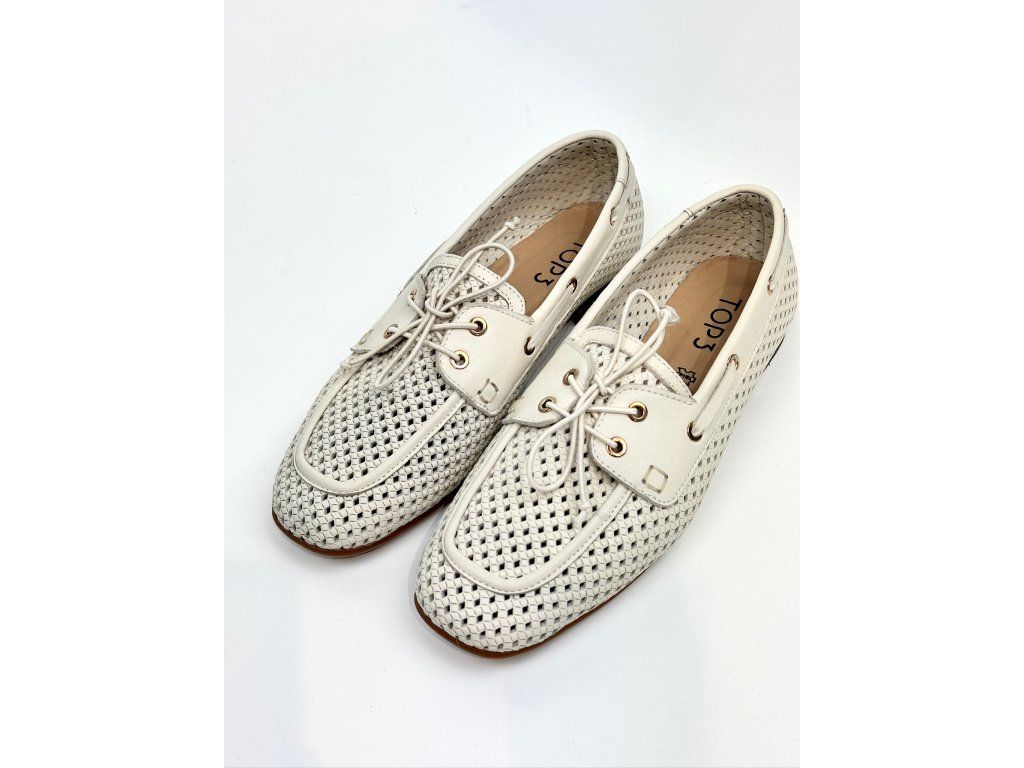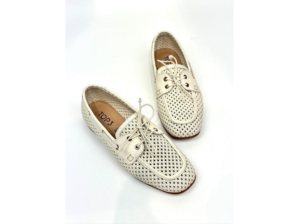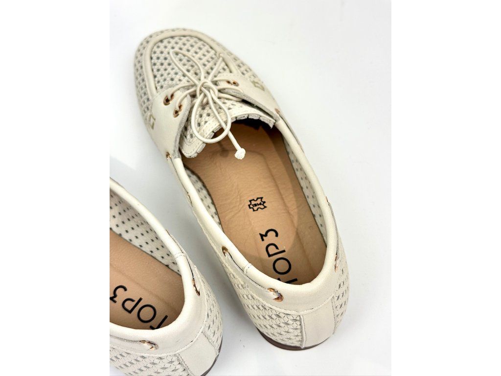 Dámské mokasíny španělské značky Top3 s čtvercovou špičkou a tkaničkami. Mokasínky mají perforovaný design a jsou vyrobené z jemné hladké kůže. Díky celokoženému provedení a kožené stélce jsou velmi měkké a pohodlné, ideální na každodenní nošení. Skvěle doplní jakýkoliv outfit - sportovně laděný i elegantní.