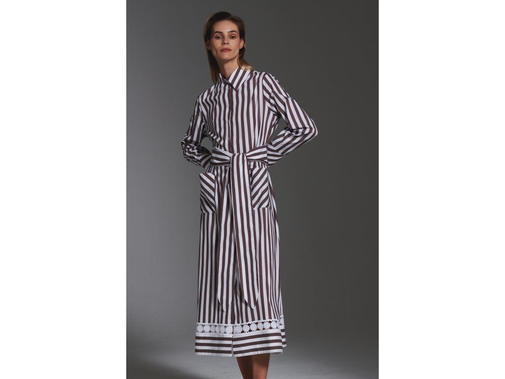Dámské pruhované šaty Milva Mi s vertikálními pruhy. Šaty jsou košilového typu, s límečkem a s dlouhým rukávem. Šatům dominují přední kapsy s diagonálním pruhováním a široký pásek stejného stylu s příčním pruhováním, které rozbíjí jinak dominantní vertikální pruhy. Ve spodní části se nachází proužek s krajkovou výšivkou s květinovým motivem.