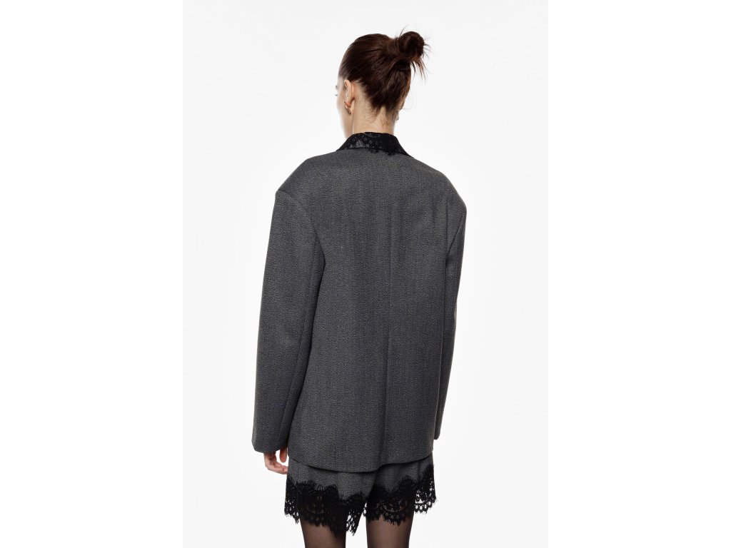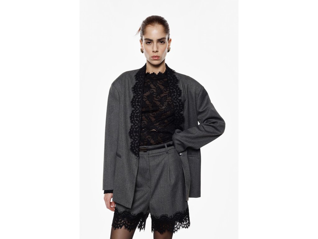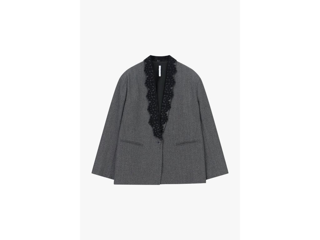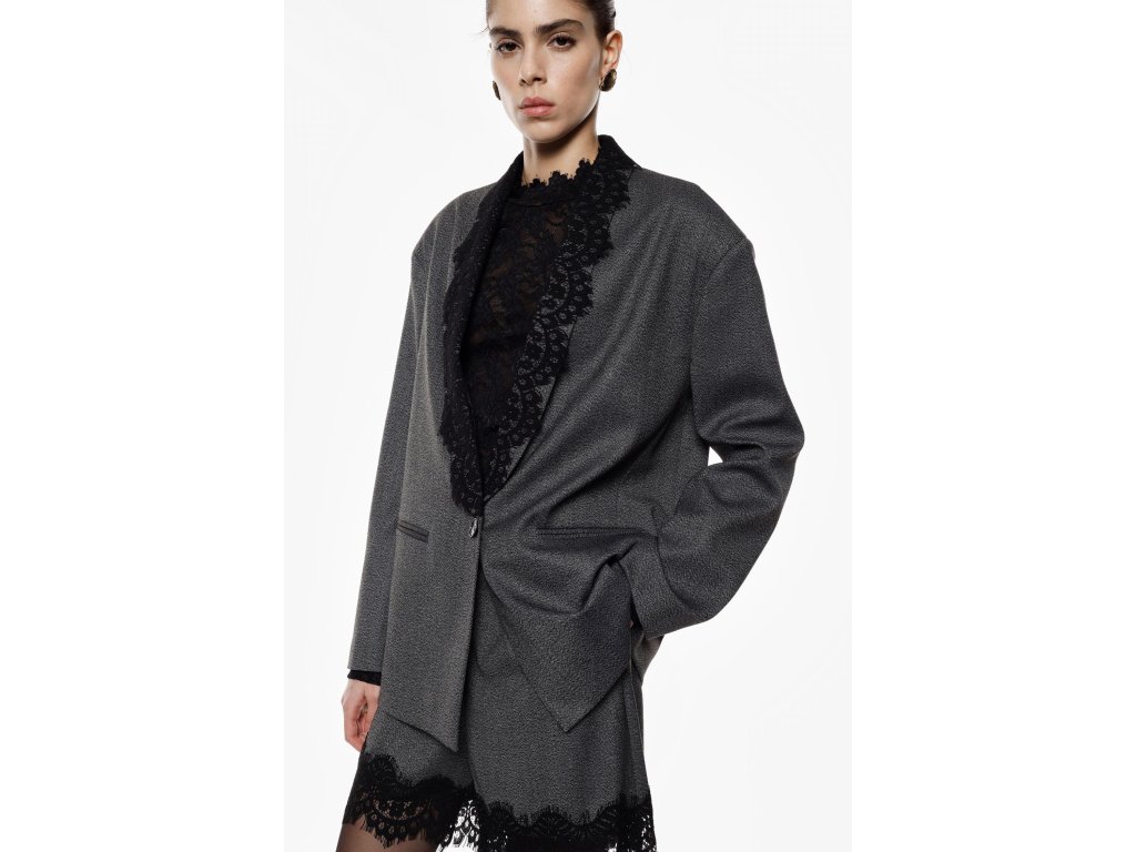 Dámské sako Imperial v šedé barvě s krajkou. Sako je oversize střihu, má jednořadé zapínání na jeden knoflík a klopy lemované černou krajkou. Je to univerzální kousek, který díky skvělým detailům povznese i obyčejný outfit na jinou úroveň.