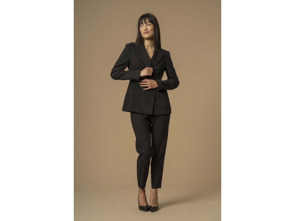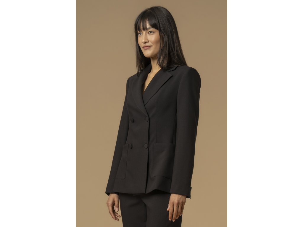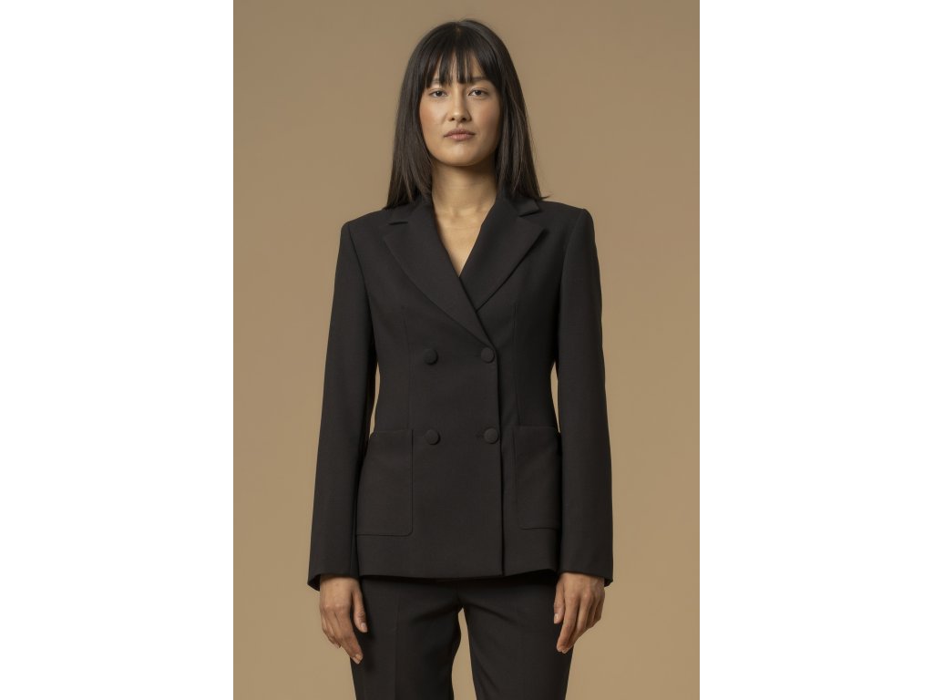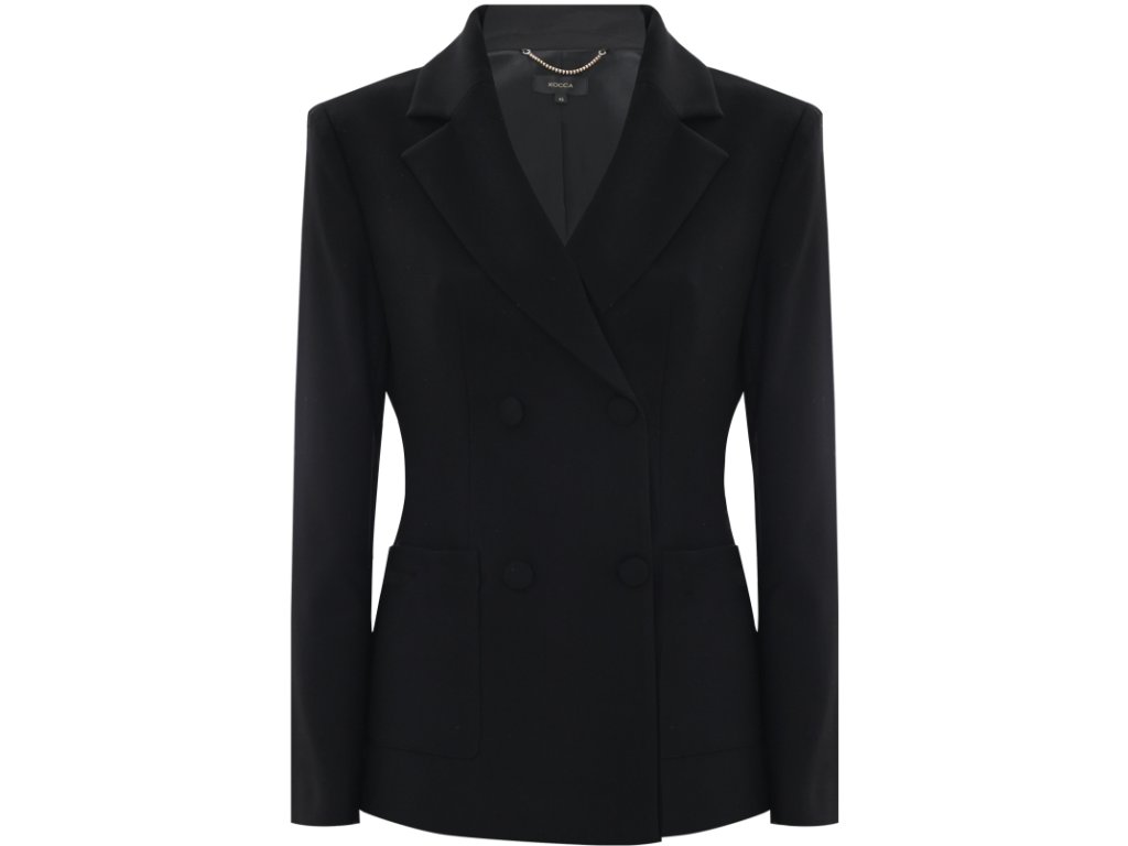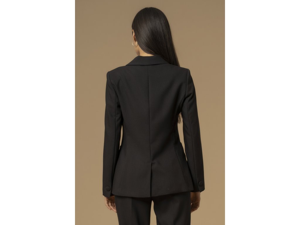 Toto dvouřadé sako vyniká svým přiléhavým střihem, který krásně definuje siluetu. Má zapínání na látkové knoflíky, kapsy a klasický klopový límec.