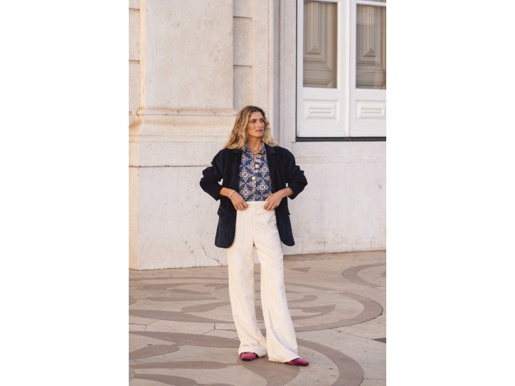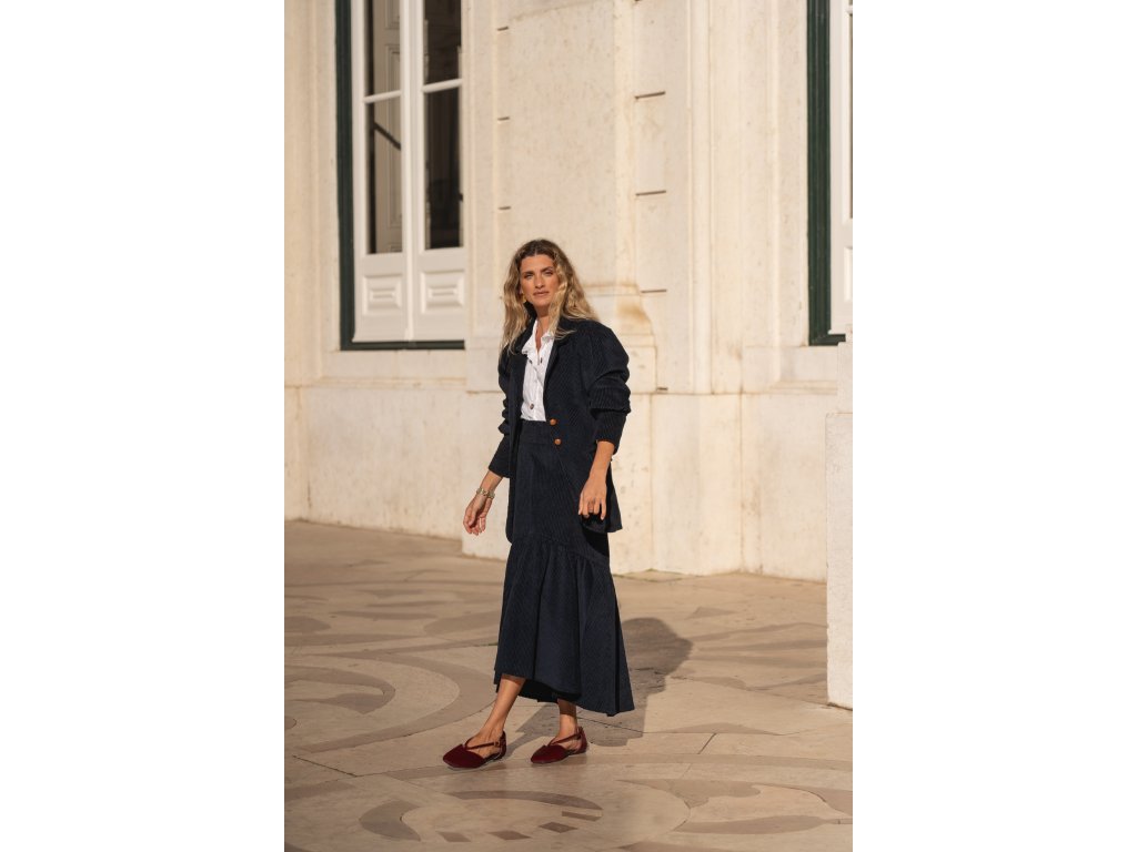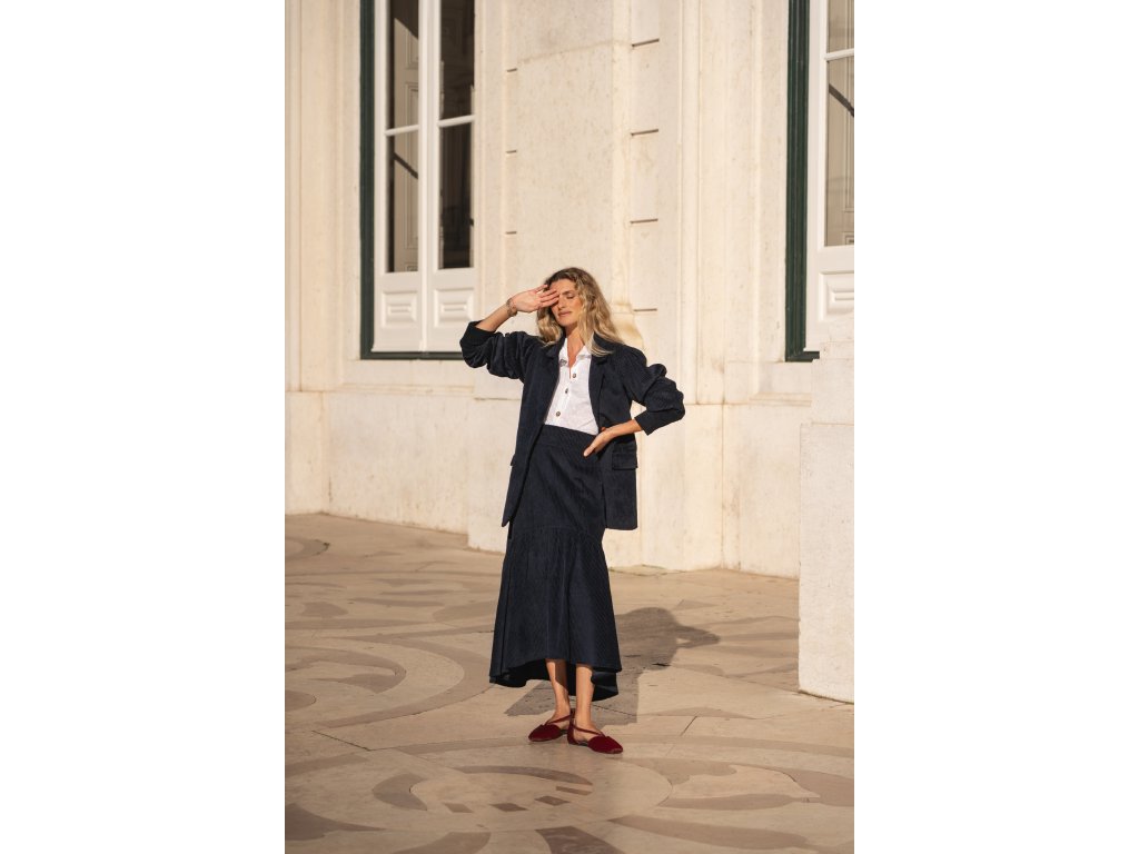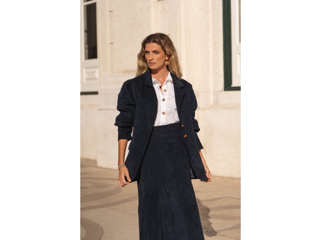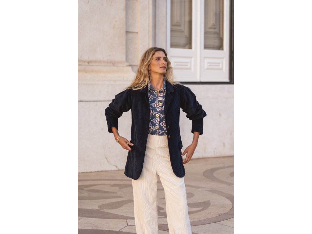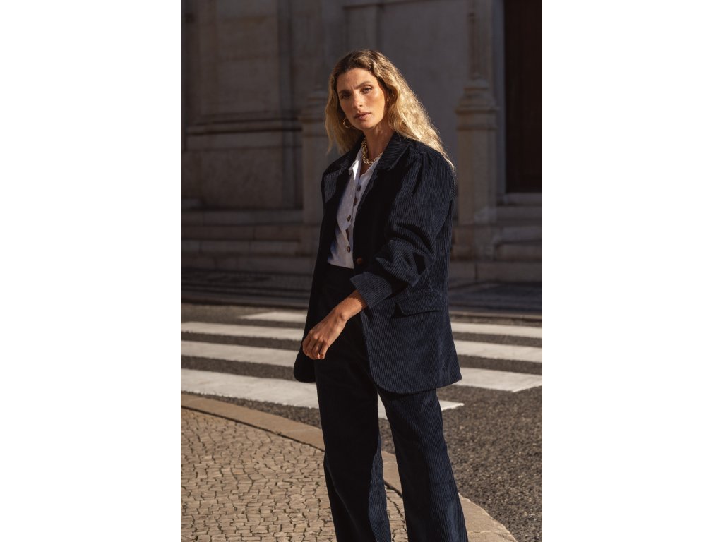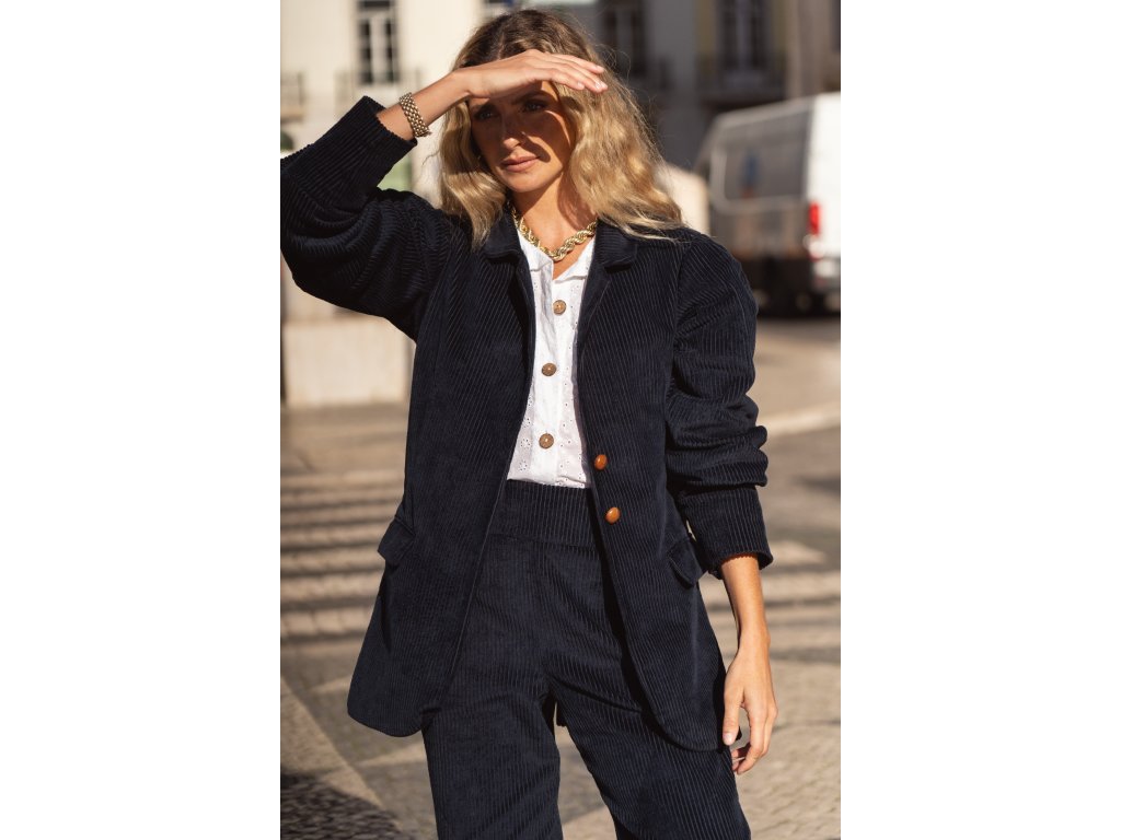 Dámské mančestrové sako portugalské značky Sole. Sako má jemné vertikální žebrování, klasický střih s velkými klopami a zapínání na knoflík. V přední části se nachází klopové kapsy. Sako má oversize střih a skvěle se kombinuje třeba se širokými kalhotami.