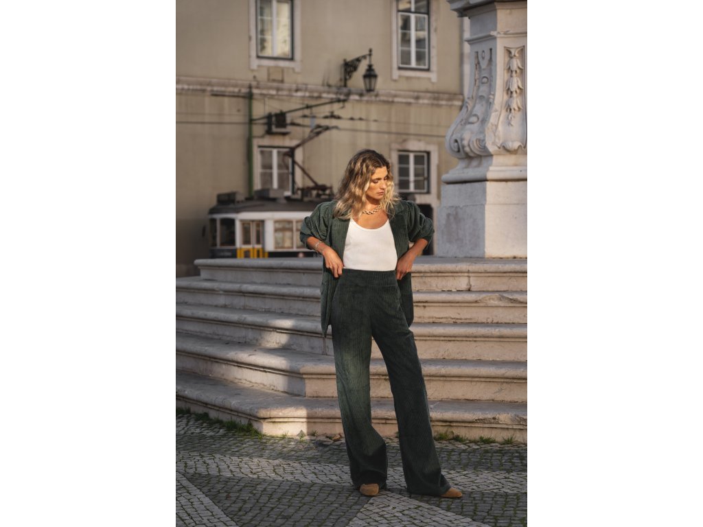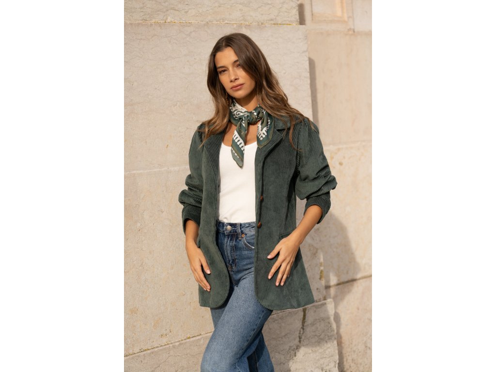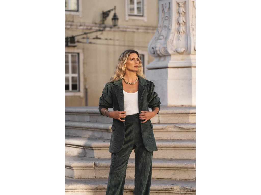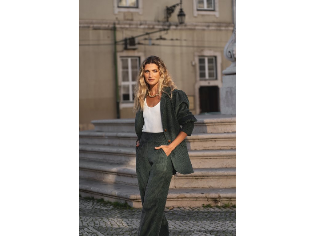 Dámské mančestrové sako portugalské značky Sole. Sako má jemné vertikální žebrování, klasický střih s velkými klopami a zapínání na knoflík. V přední části se nachází klopové kapsy. Sako má oversize střih a skvěle se kombinuje třeba se širokými kalhotami.