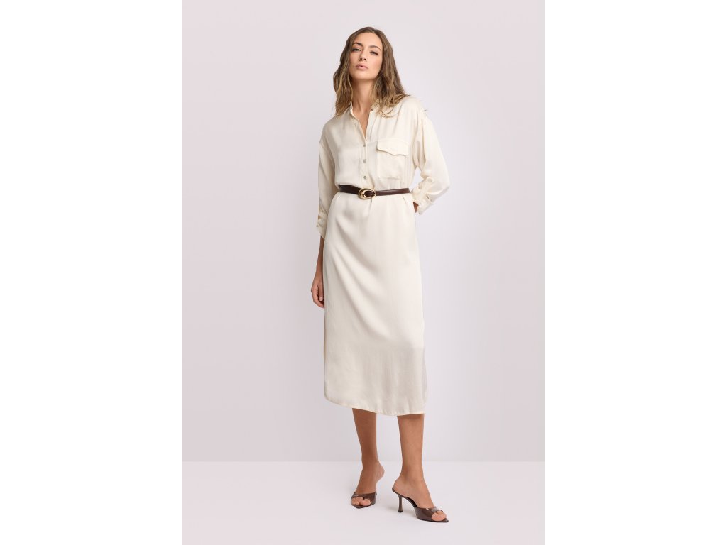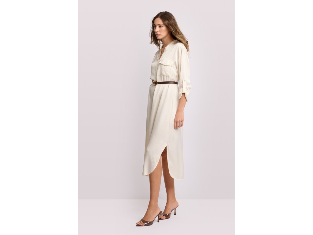Košilové šaty z kapslové kolekce Pure Verve. Zapínání na knoflíky vepředu a kontrastní pásek, který definuje pas a ženskou siluetu.