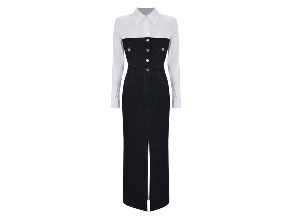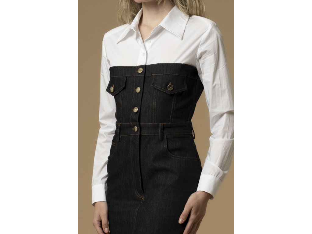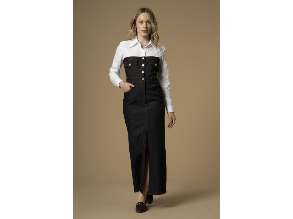 Dlouhé denimové šaty s košilovým límečkem a manžetami na rukávech. Šaty mají džínový živůtek s kovovými knoflíky s logem, předními kapsami a předním rozparkem.