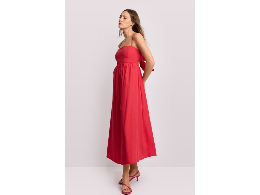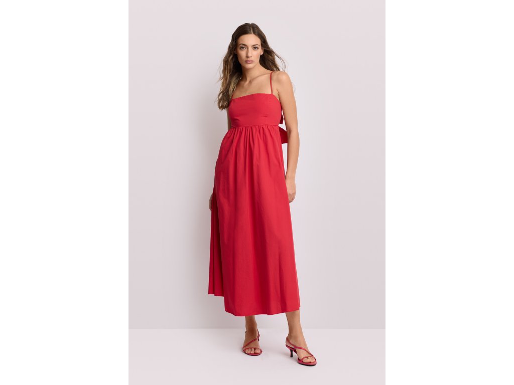 Dlouhé bavlněné šaty s nastavitelnými tenkými ramínky. Plně plisovaná sukně s definovaným pasem s velkou mašlí na zavazování vzadu.