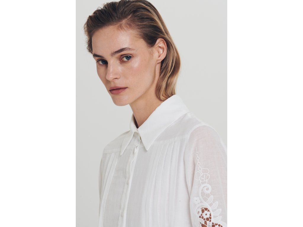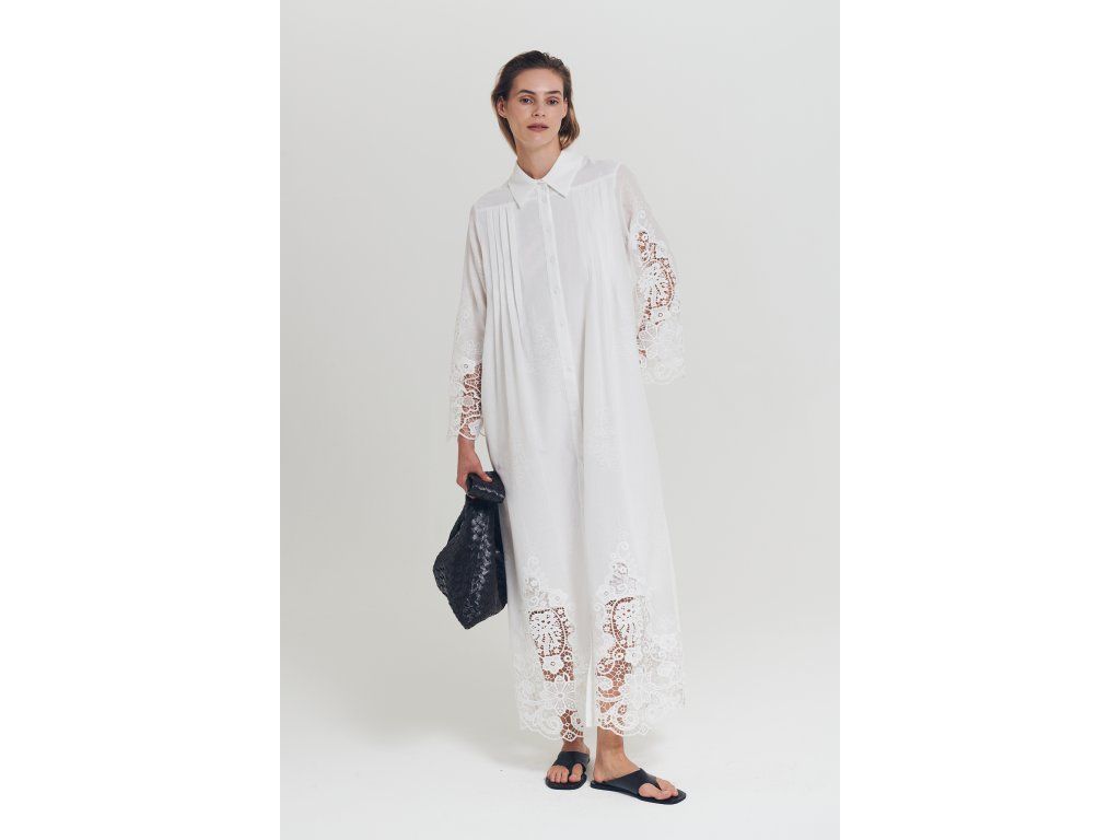 Dlouhé dámské šaty Milva Mi s límečkem a vertikálními sklady ve vrchní části. Šaty jsou košilového střihu se zapínáním na knoflíky. Dlouhé volné rukávy na koncích přechází do čisté krajky. Sukně je volná, široká, áčkového střihu. Ve spodní části přechází, podobně jak u rukávů, do krajky, která nahrazuje spodní lem.