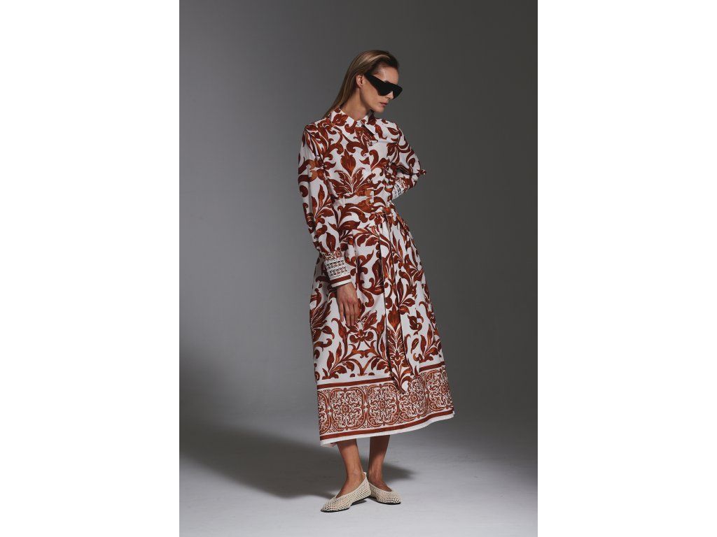 Dlouhé dámské šaty italské značky Milva Mi v hnědo-bílé kombinaci. Košilové šaty se zapínáním na knoflíky a s páskem pro zvýraznění pasu se stejným motivem. Šaty mají dlouhý rukáv a dlouhou sukni áčkového střihu. Šaty jsou ideální na neformální každodenní příležitosti a na volný čas strávený ve městě nebo na dovolené.