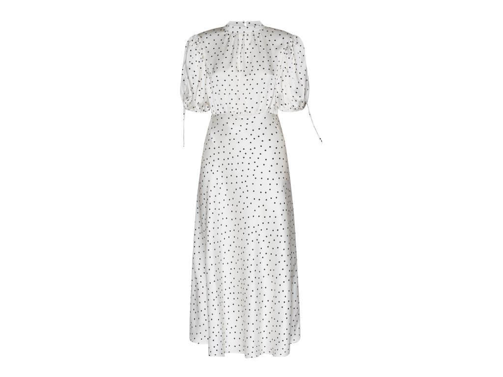 Dámské šaty s decentní elegancí a rafinovaným stylem, s jemným grafickým motivem, který dodává designu rytmus a lehkost. Konstrukce je definována plynulými liniemi a objemnými rukávy, které vytvářejí harmonickou rovnováhu mezi ženskostí a strukturou. Model navržený tak, aby interpretoval sofistikovaný a moderní styl s přirozenou elegancí.
