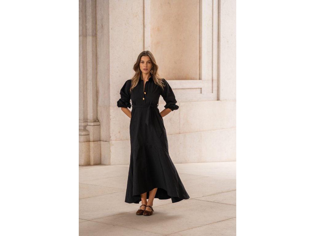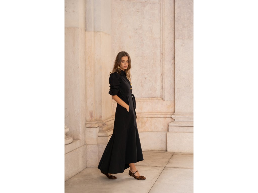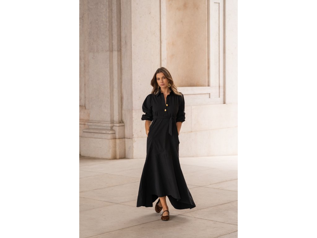 Dlouhé dámské šaty portugalské značky Sole v černé barvě. Šaty mají hluboký výstřih do V s knoflíky, volné rukávy tříčtvrteční délky a dlouhou kombinovanou sukni. Sukně je ve vrchní části rovnějšího střihu, předěluje ji lem v oblasti kolen, od kterého se sukně víc rozšiřuje do volánového střihu. Šaty si můžete v oblasti pasu utáhnout páskem stejné barvy, který Vám hezky vytvaruje siluetu a dodá šatům ženskost a eleganci.