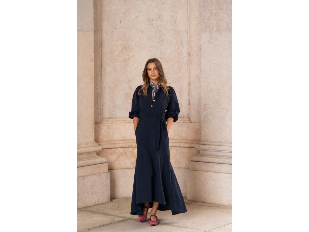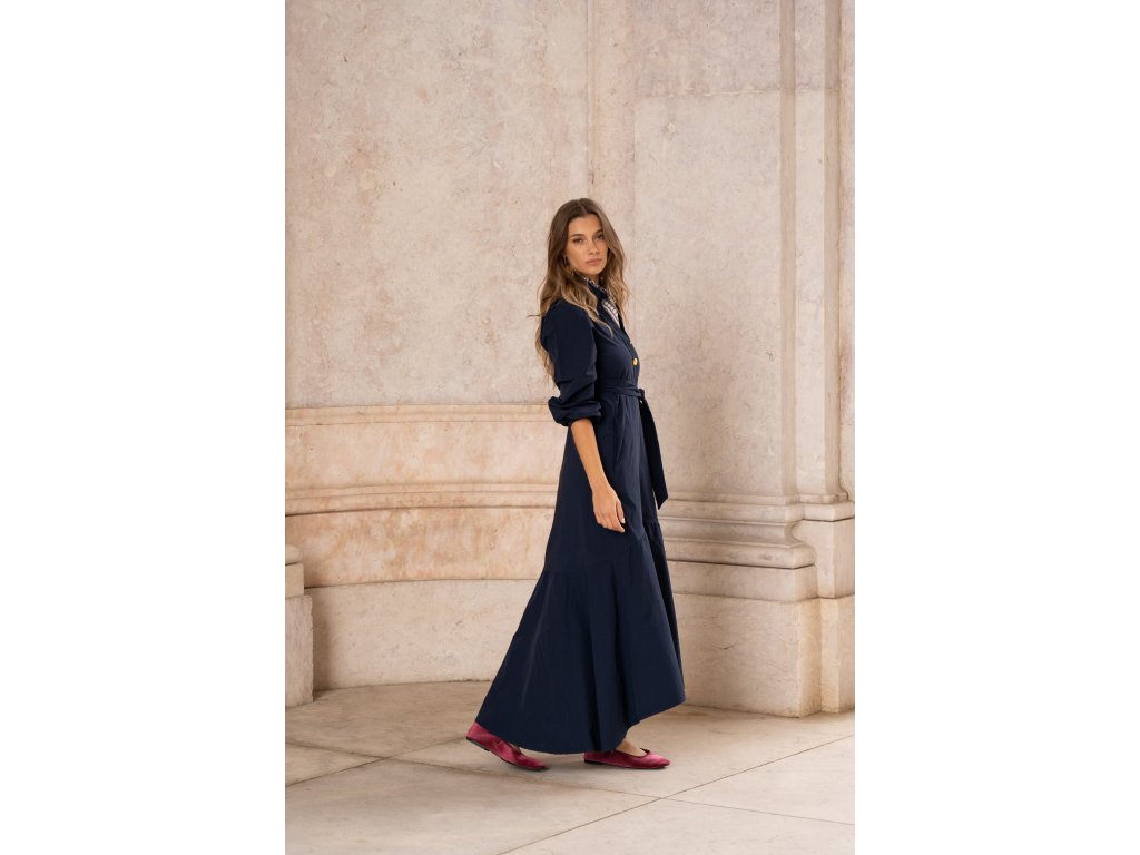 Dlouhé dámské šaty portugalské značky Sole v tmavě modré barvě. Šaty mají hluboký výstřih do V s knoflíky, volné rukávy tříčtvrteční délky a dlouhou kombinovanou sukni. Sukně je ve vrchní části rovnějšího střihu, předěluje ji lem v oblasti kolen, od kterého se sukně víc rozšiřuje do volánového střihu. Šaty si můžete v oblasti pasu utáhnout páskem stejné barvy, který Vám hezky vytvaruje siluetu a dodá šatům ženskost a eleganci.