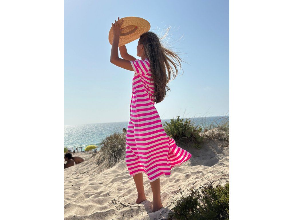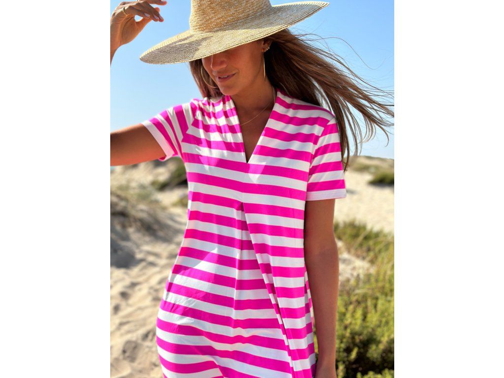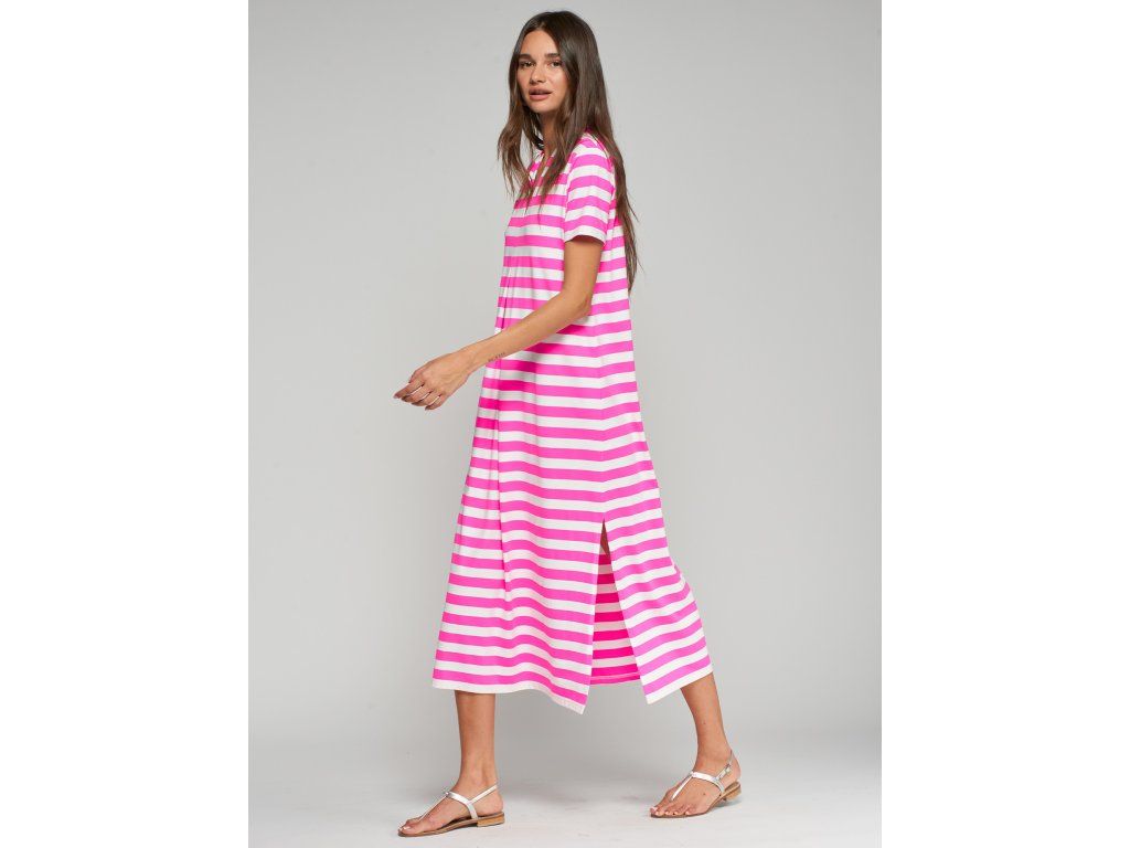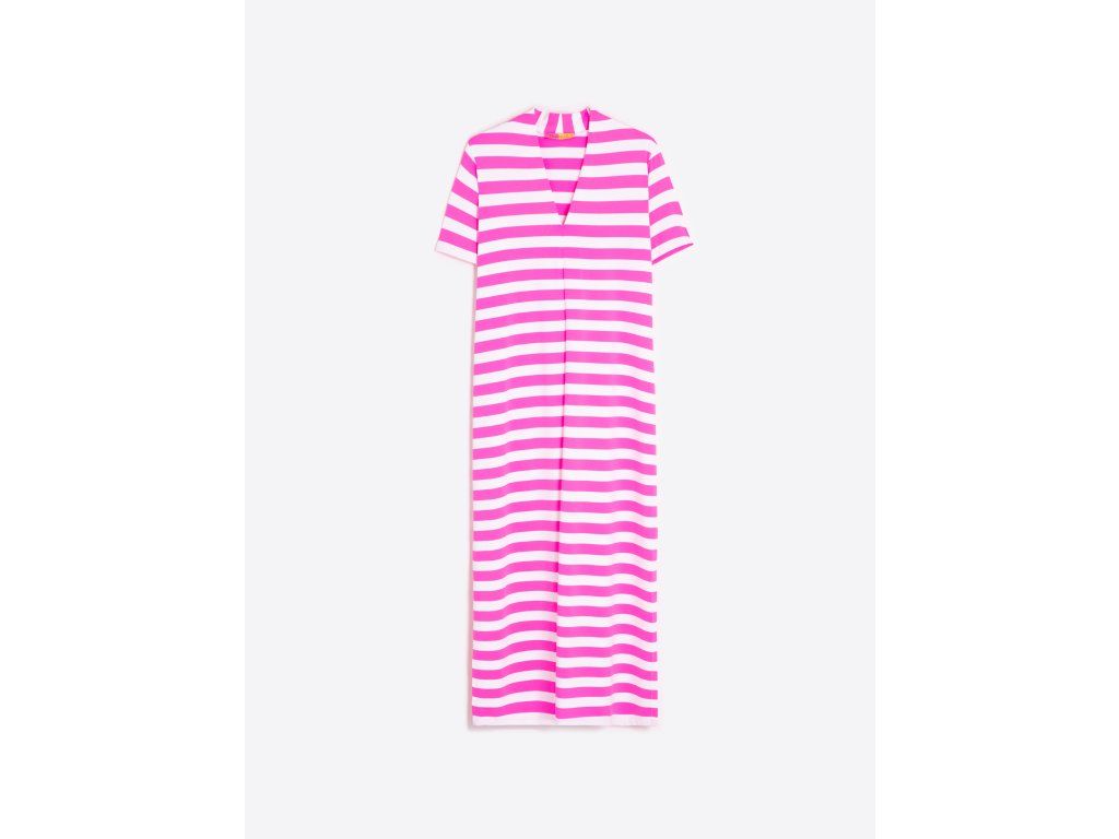 Dlouhé šaty rovného střihu s horizontálním pruhovaným potiskem v bílé a fuchsiové barvě.