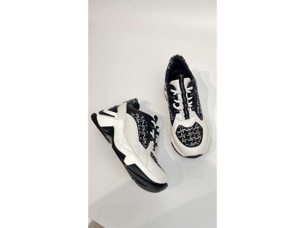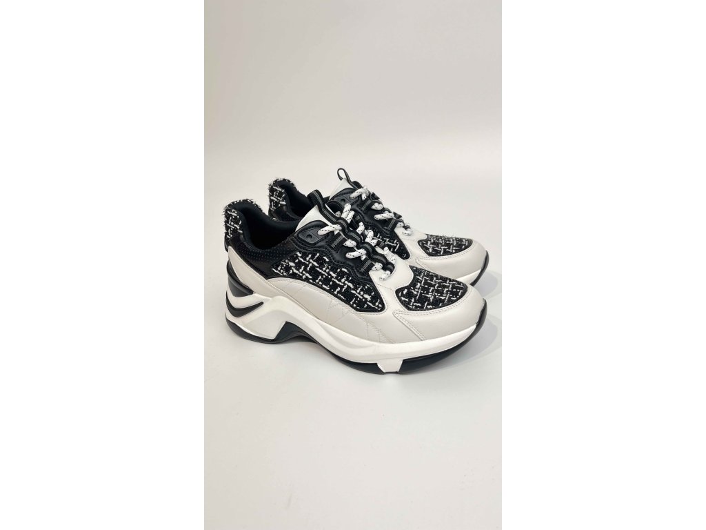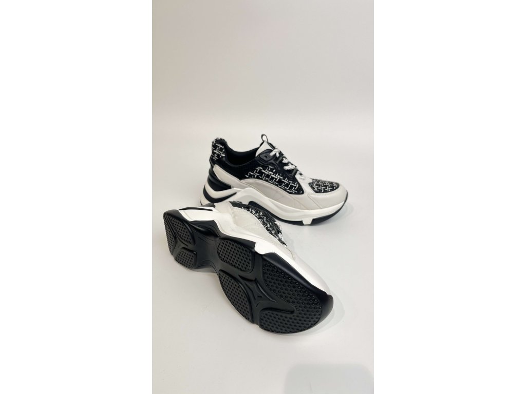 Dámské mohutné tenisky EXE v černo-bílé kombinaci. Tenisky dokonale kloubí masivní sportovní look s jemností a elegancí, přesto nepůsobí kýčovitě. Masivní podrážka v kombinaci s elastickými tkaničkami zaručuje dokonalé pohodlí při celodenním nošení. Rozzářte svůj botník těmito netypickými stylovkami! Tenisky jsou vyrobeny z kombinace hladké kůže, textilu a syntetiky. Těmito botami rozhodně nešlápnete vedle!