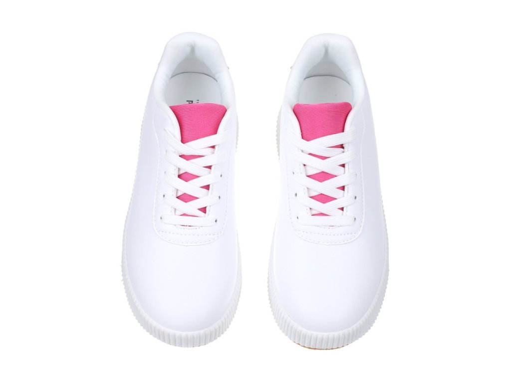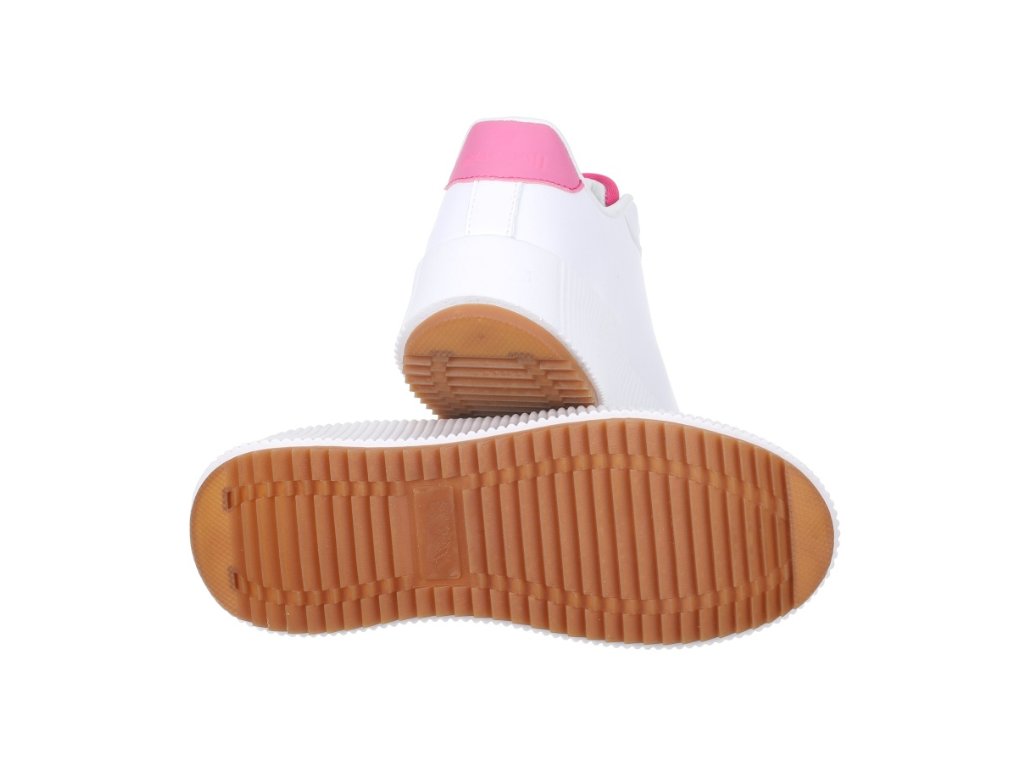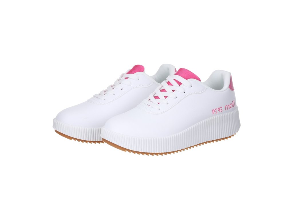 Dámské tenisky Pepe Moll z kvalitní ekologické kůže. Bílé tenisky jsou základem každého šatníku - hodí se k většině každodenních outfitů. Tenisky mají středně vysokou, mírně se zvyšující platformou. Výška platformy v patě je 5 cm. Růžový detail na patě dodává teniskám hravost a originální design.