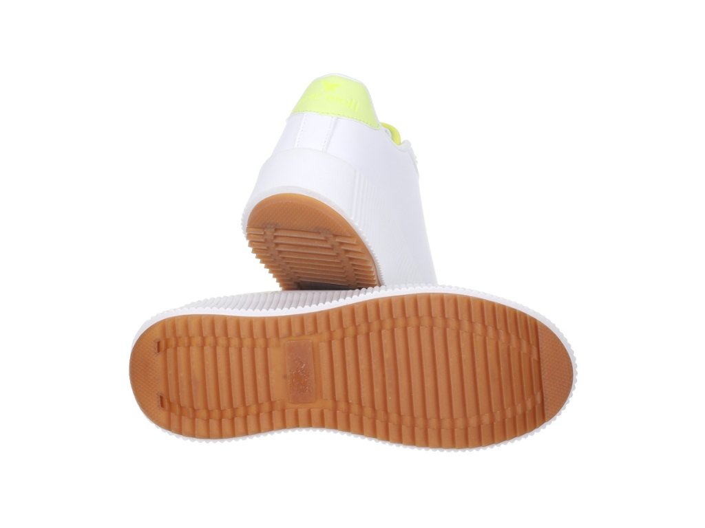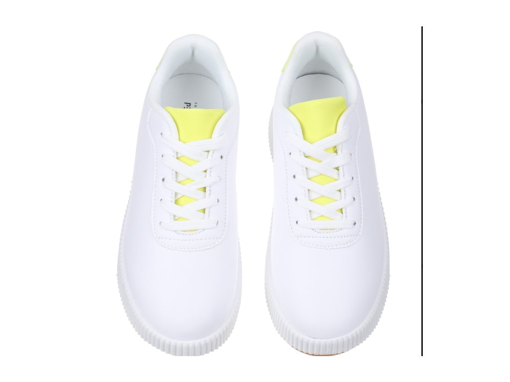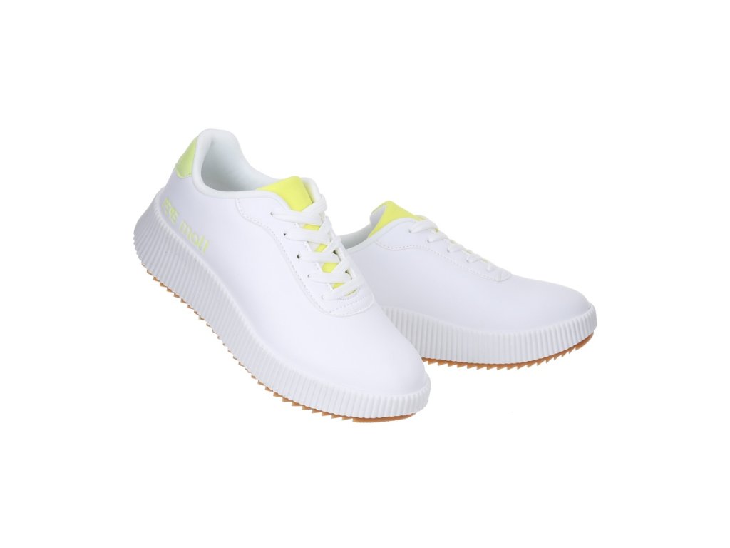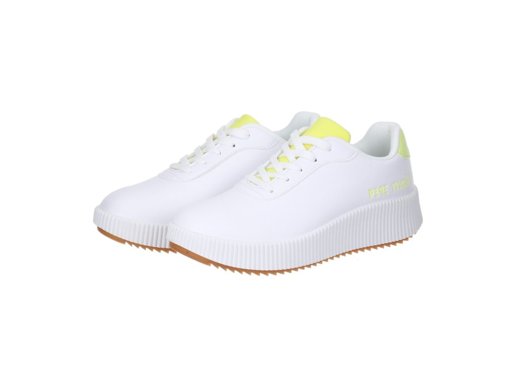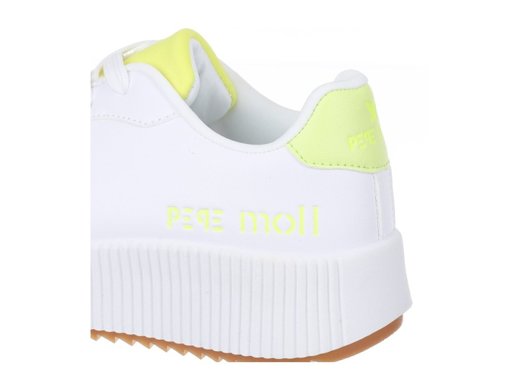 Dámské tenisky Pepe Moll z kvalitní ekologické kůže. Bílé tenisky jsou základem každého šatníku - hodí se k většině každodenních outfitů. Tenisky mají středně vysokou, mírně se zvyšující platformou. Výška platformy v patě je 5 cm. Žlutý detail na patě dodává teniskám hravost a originální design.