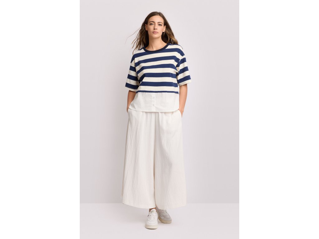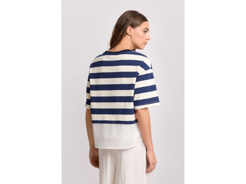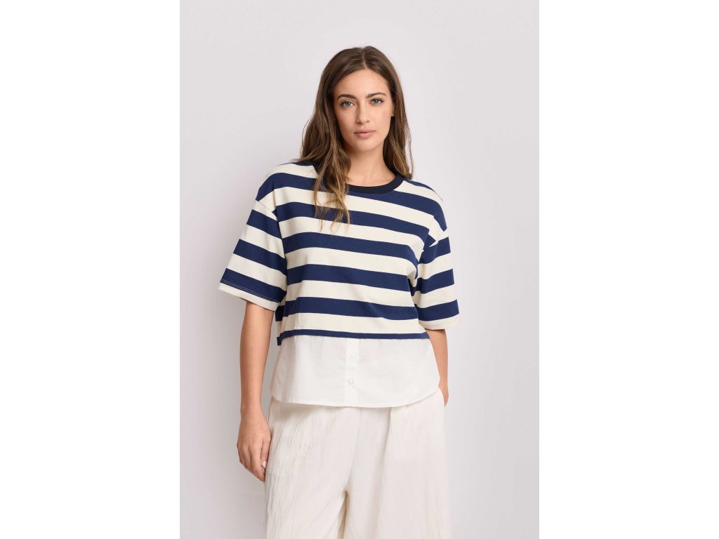 Vrstvené tričko s pruhovaným topem a bílým košilovým lemem s odhalenými knoflíky. Tričko má kontrastní kulatý výstřih. Model má volný střih hranatého tvaru s rovnými krátkými rukávy. Je to perfektní kousek do práce (smart-casual) nebo třeba na drink ve městě.