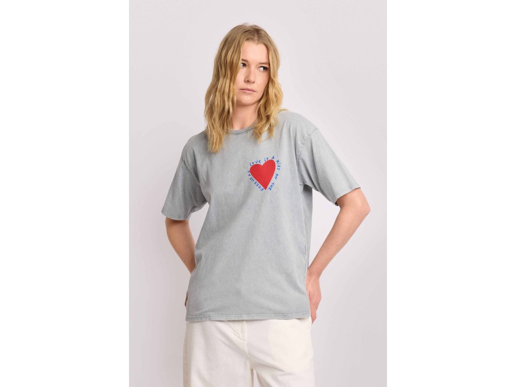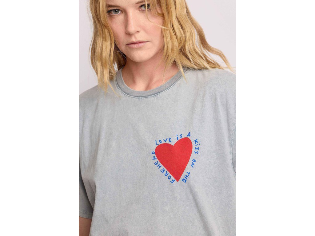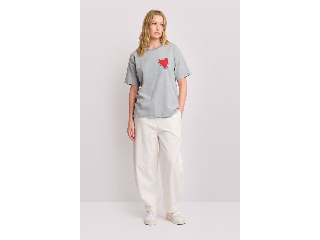 Tričko s krátkým rukávem, volným, oversized střihem a spuštěnými rameny, které zdůrazňují ležérní, streetwear styl tohoto modelu. Potisk červených srdíček na přední a zadní straně. Tričo má klasický žebrovaný výstřih z bavlněného žerzeje.