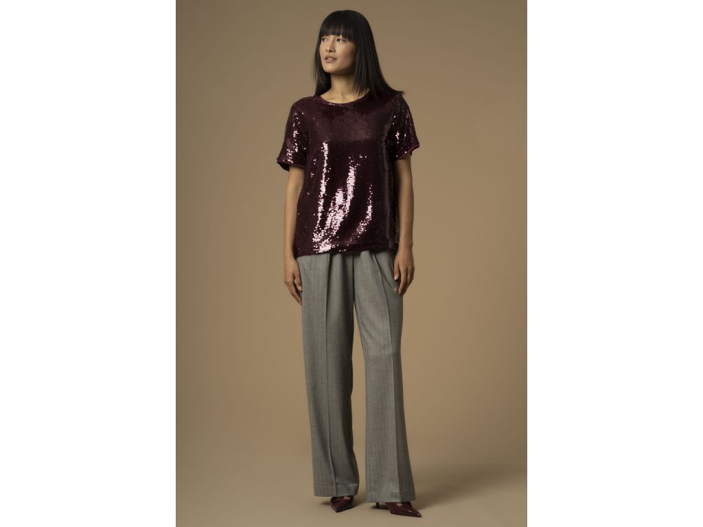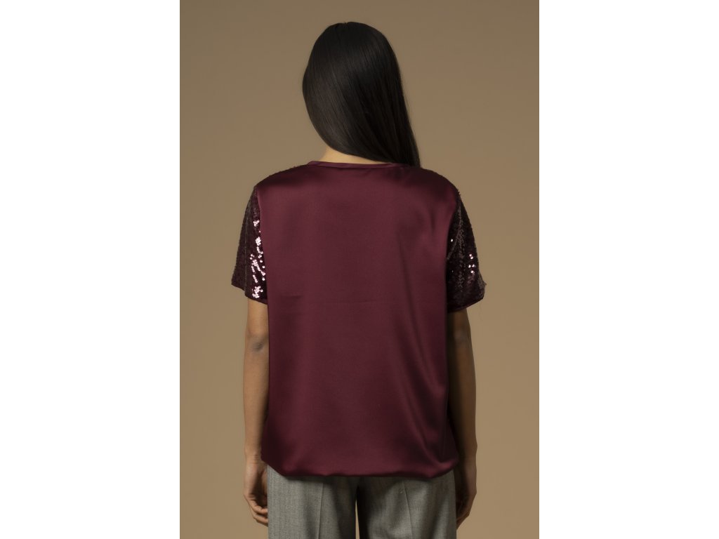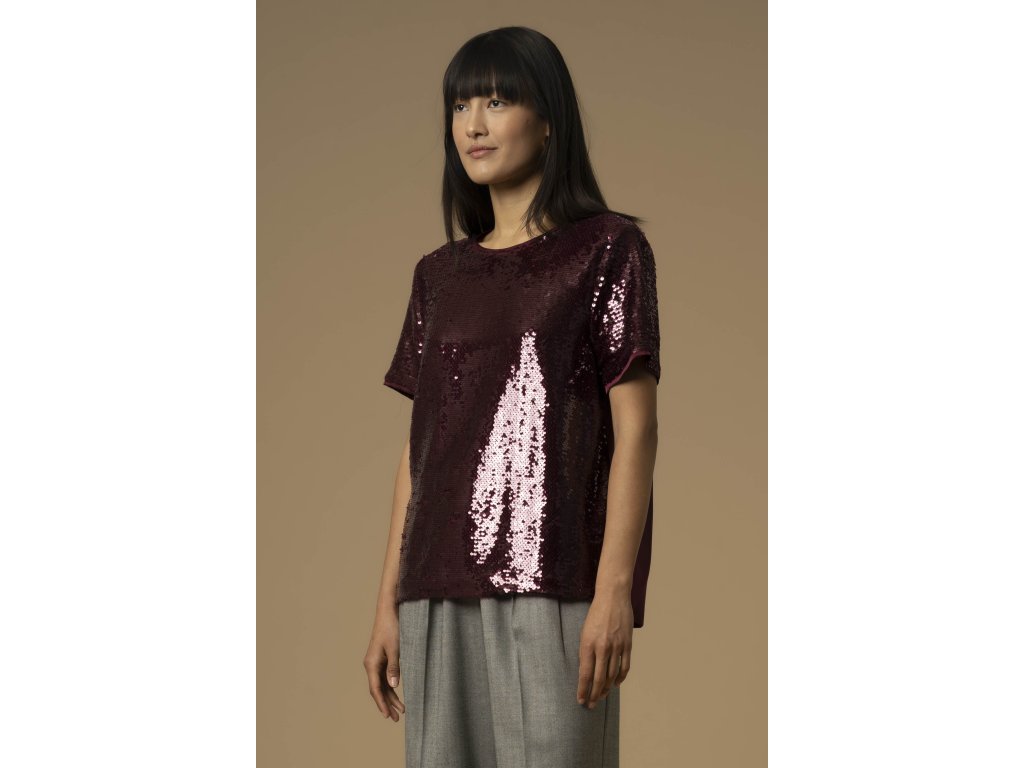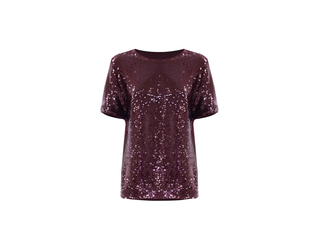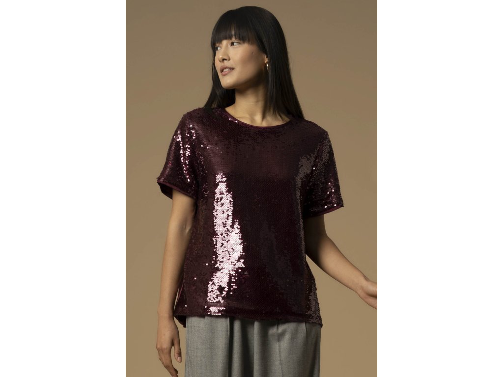 Tato halenka s krátkým rukávem je ideální pro speciální příležitosti. Je zdobena flitrovým motivem, který jí dodává třpytivý vzhled. Má rovný  volný střih.