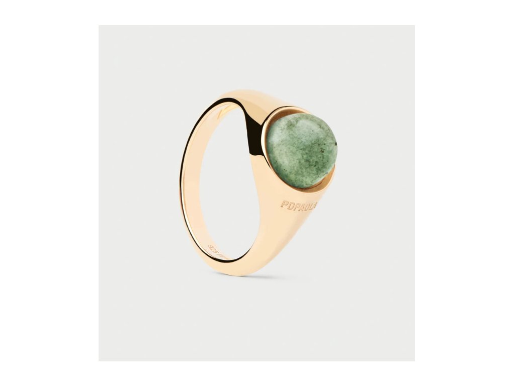 Pozlacený prsten ve tvaru půlkoule s oválným zeleným drahokamem.