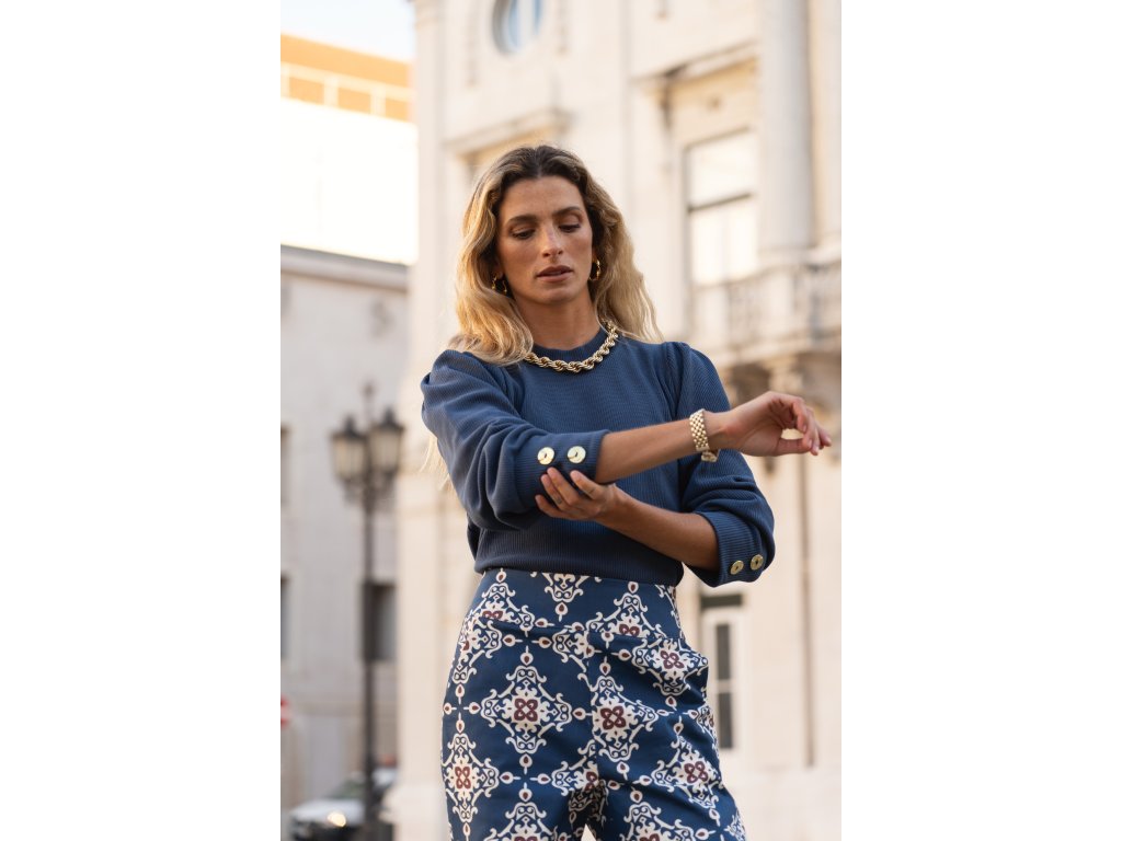 Dámský svetr portugalské značky SOLE v tlumené modré barvě. Svetr má jemné vertikální žebrování a mírně volánkové rukávy tříčtvrteční délky. Na konci rukávů jsou zlaté knoflíky, které dodávají svetru elegantní vzhled a ženskost.