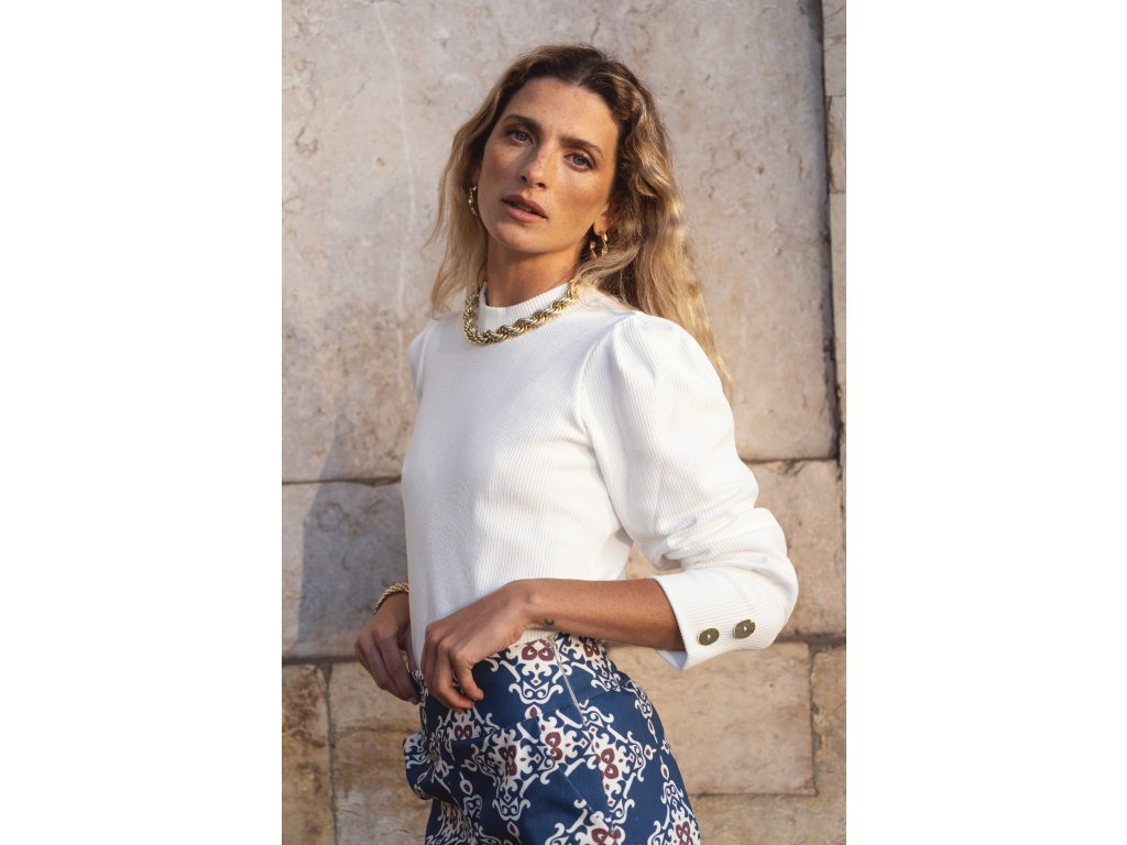 Dámský svetr portugalské značky SOLE v bílé barvě. Svetr má jemné vertikální žebrování a mírně volánkové rukávy tříčtvrteční délky. Na konci rukávů jsou zlaté knoflíky, které dodávají svetru elegantní vzhled a ženskost.