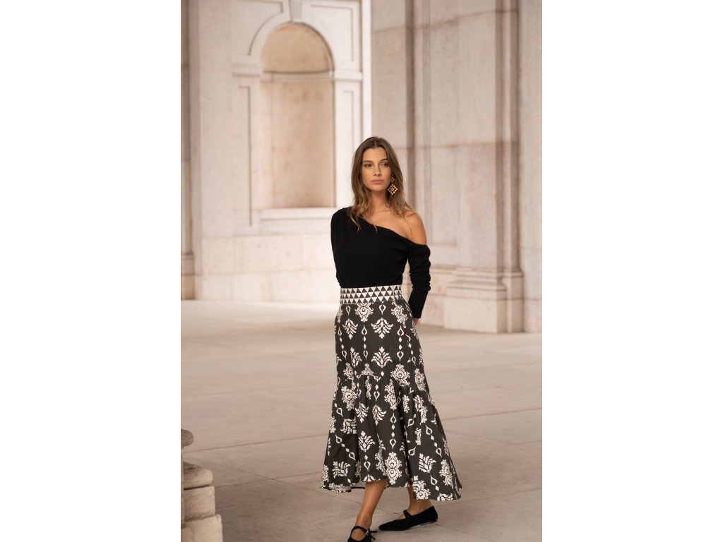 Dámský svetr portugalské značky SOLE v klasické černé barvě. Svetr má jemné vertikální žebrování a dlouhý rukáv. Na jedné straně má odhalené rameno, co působí velmi žensky a rafinovaně. Perfektně se hodí třeba k pouzdrovým sukním, kostýmovým i rozšířeným kalhotám anebo dlouhé sukni áčkového střihu.