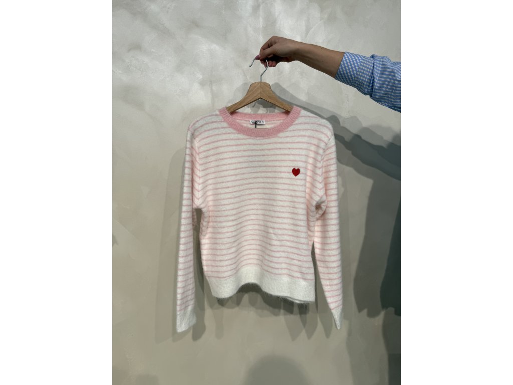 Dámský svetřík Civico bílo-růžový s horizontálními pruhy. Svetr má žebrovaný límeček i lemy na rukávech. Velikost UNI