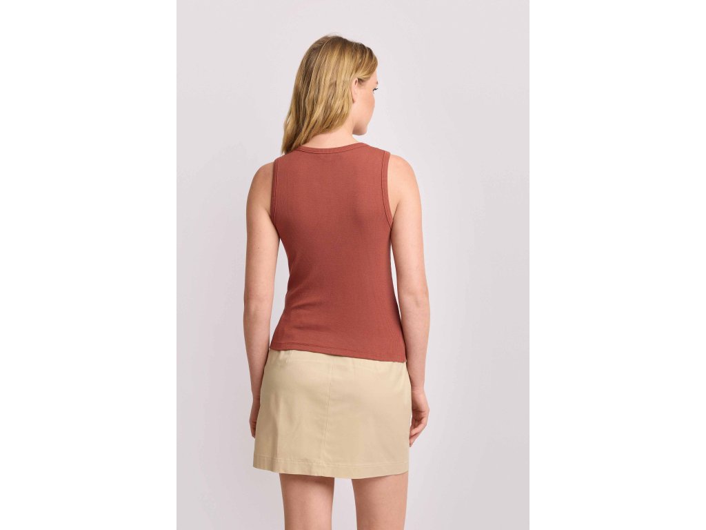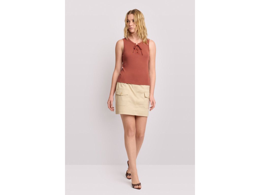 Top bez rukávů s kulatým výstřihem a zapínáním na šněrování. Jemně žebrovaný materiál, přiléhavý a pohodlný střih - to je záruka Vašeho pohodlí na každý den. Vhodné prokaždodenní outfit nebo pro aktivity na volný čas.