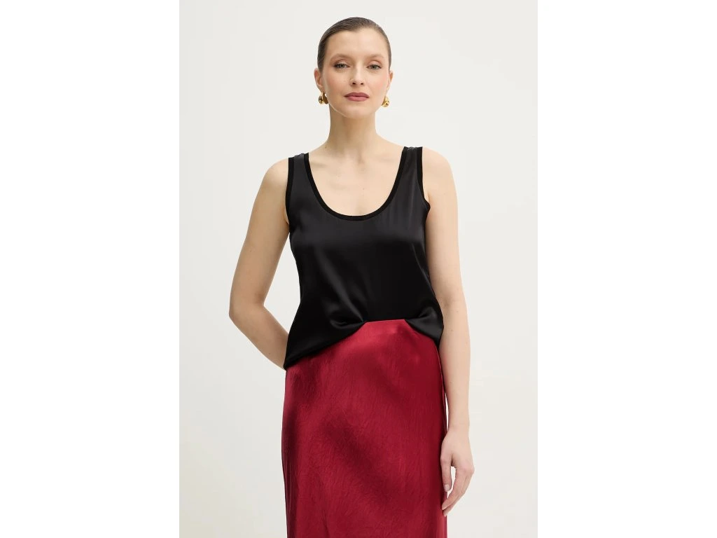 Čisté a sofistikované tričko bez rukávů s kontrastními lemy, které definují profil oděvu s decentní elegancí. Esenciální design umocňuje moderní pojetí luxusního minimalismu, díky čemuž je tento kousek ideální pro moderní, rafinovaný a všestranný šatník.