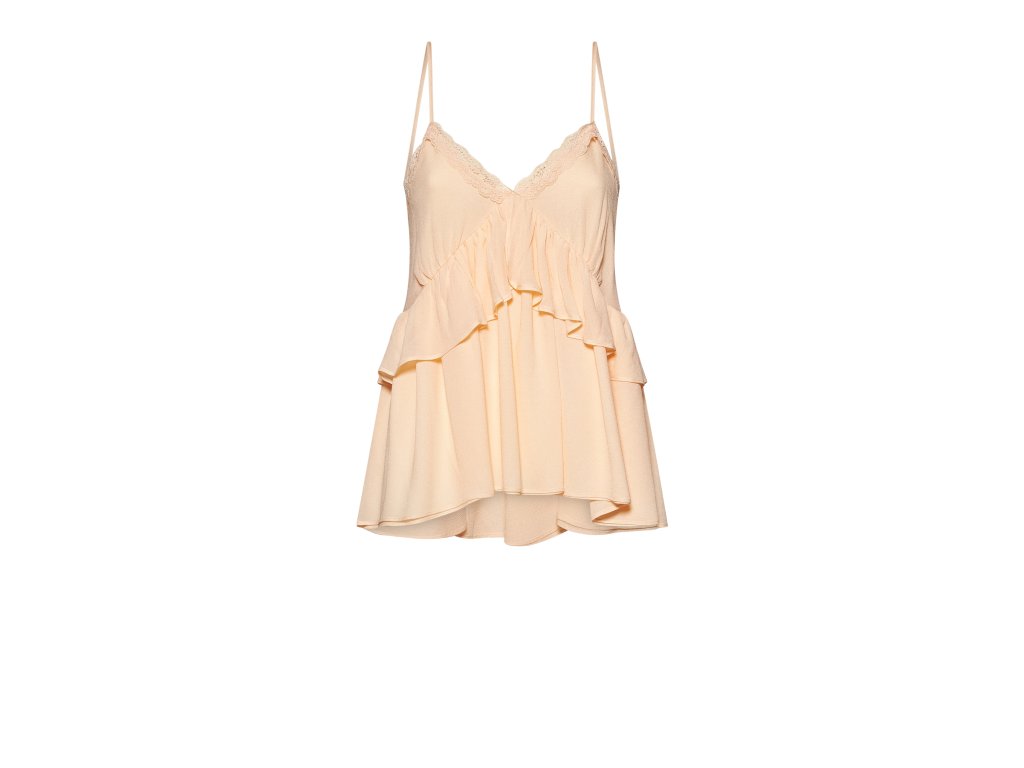 Ženský a sofistikovaný top s vrstvenou konstrukcí, která celkovému vzhledu dodává pohyb a lehkost. Tenká ramínka a jemně dokončený profil umocňují elegantní a moderní estetiku, díky čemuž je tento kousek luxusní volbou pro rafinovaný a harmonický šatník.